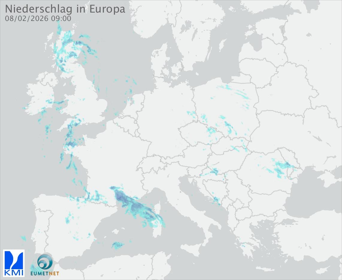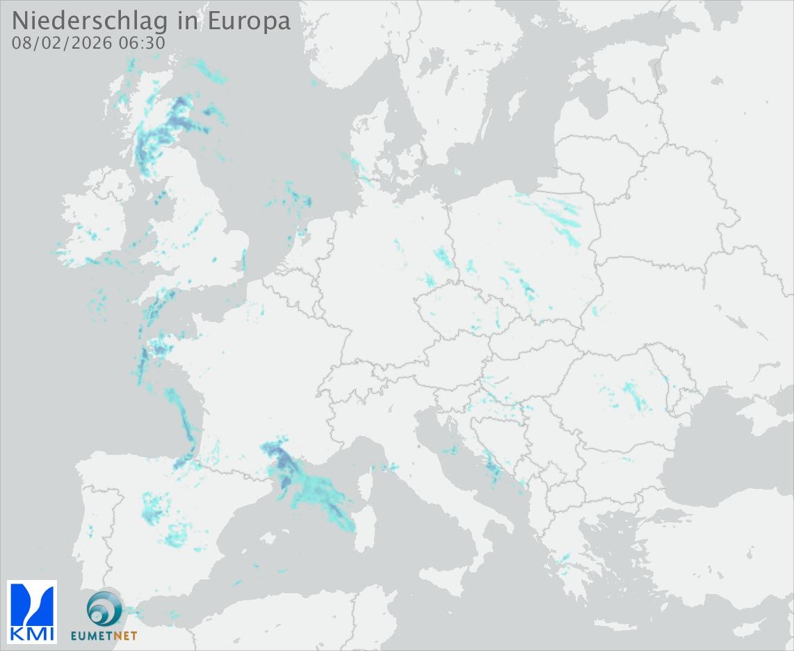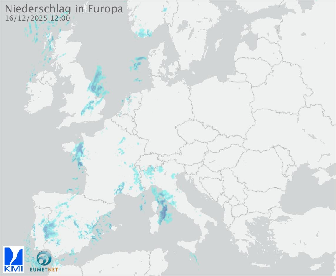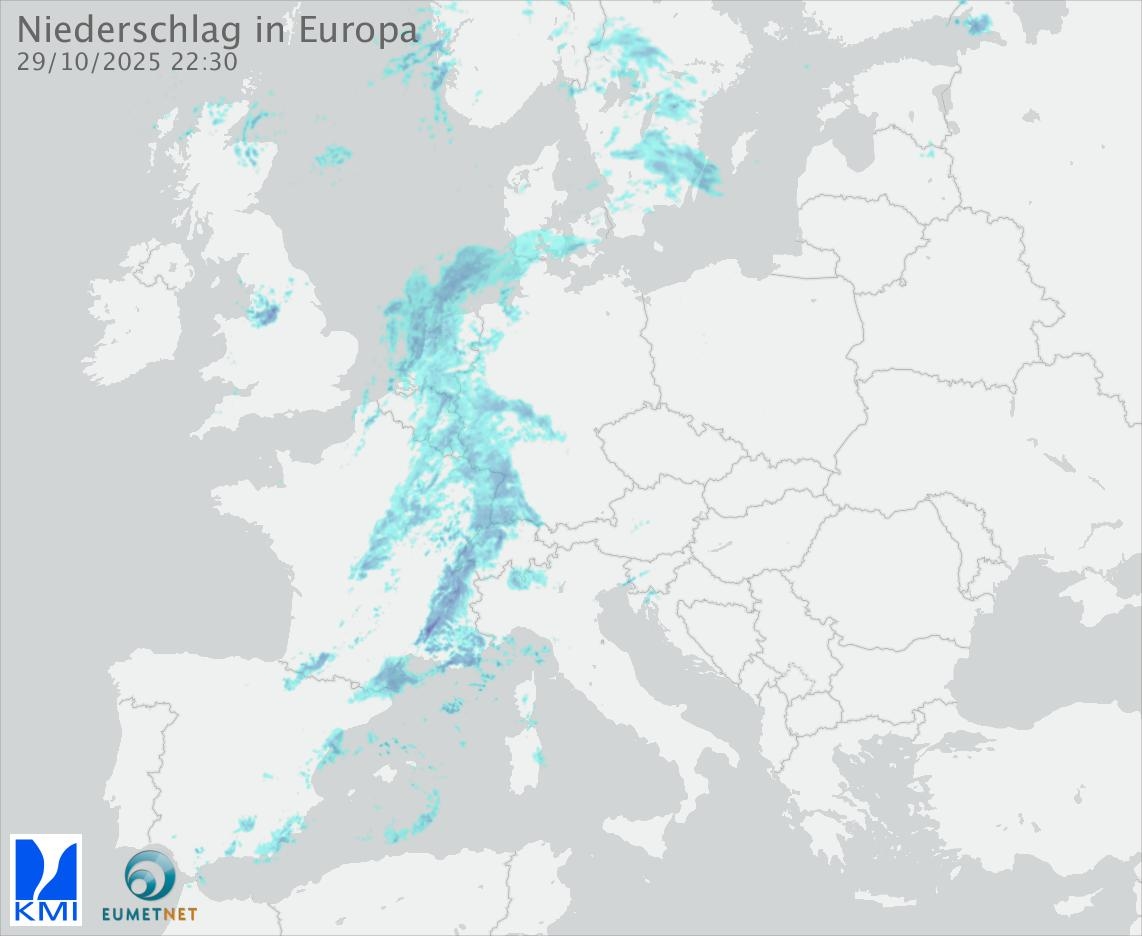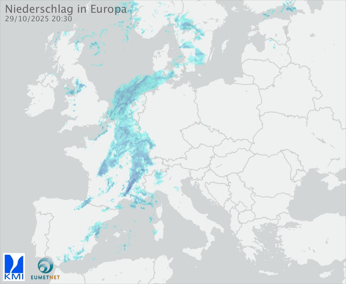 Diese Animation zeigt den gefallenen Niederschlag, gemessen durch die Regenradargeräte der europäischen Teilnehmer des Eumetnet-Programms OPERA (in 15-Minuten-Intervallen).
