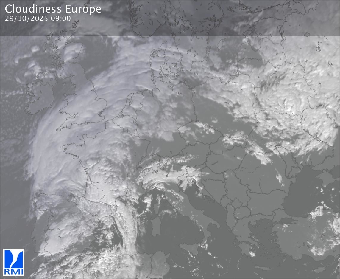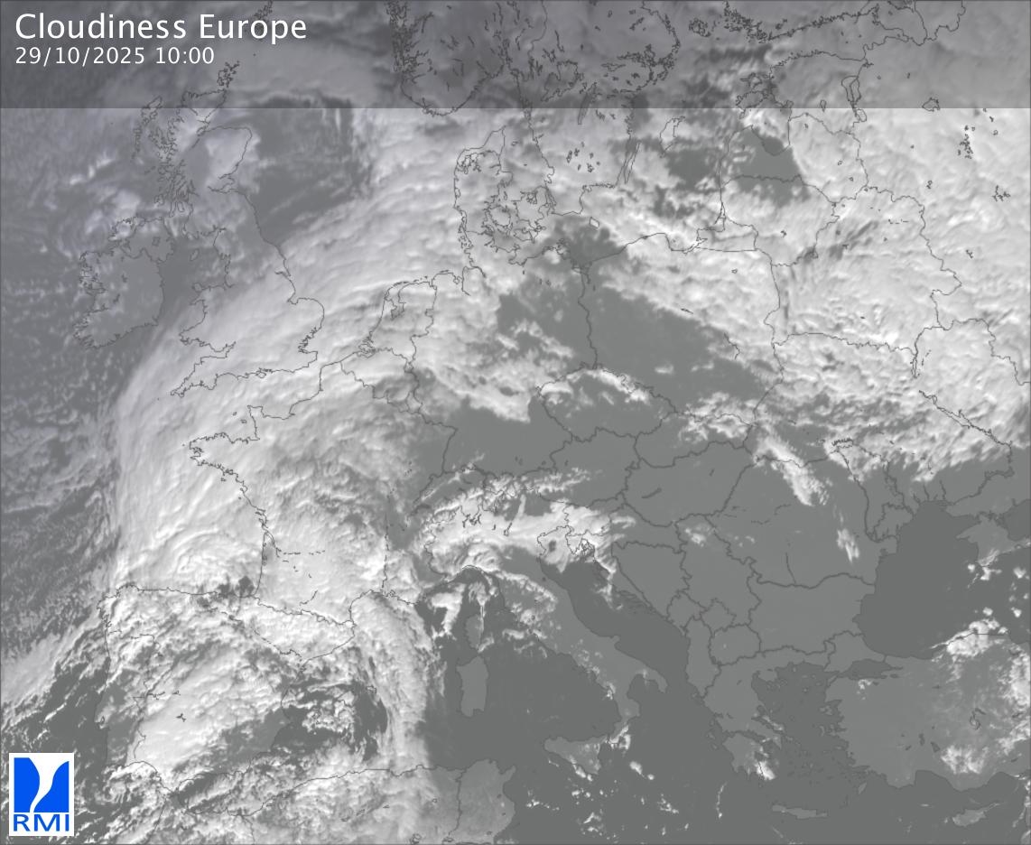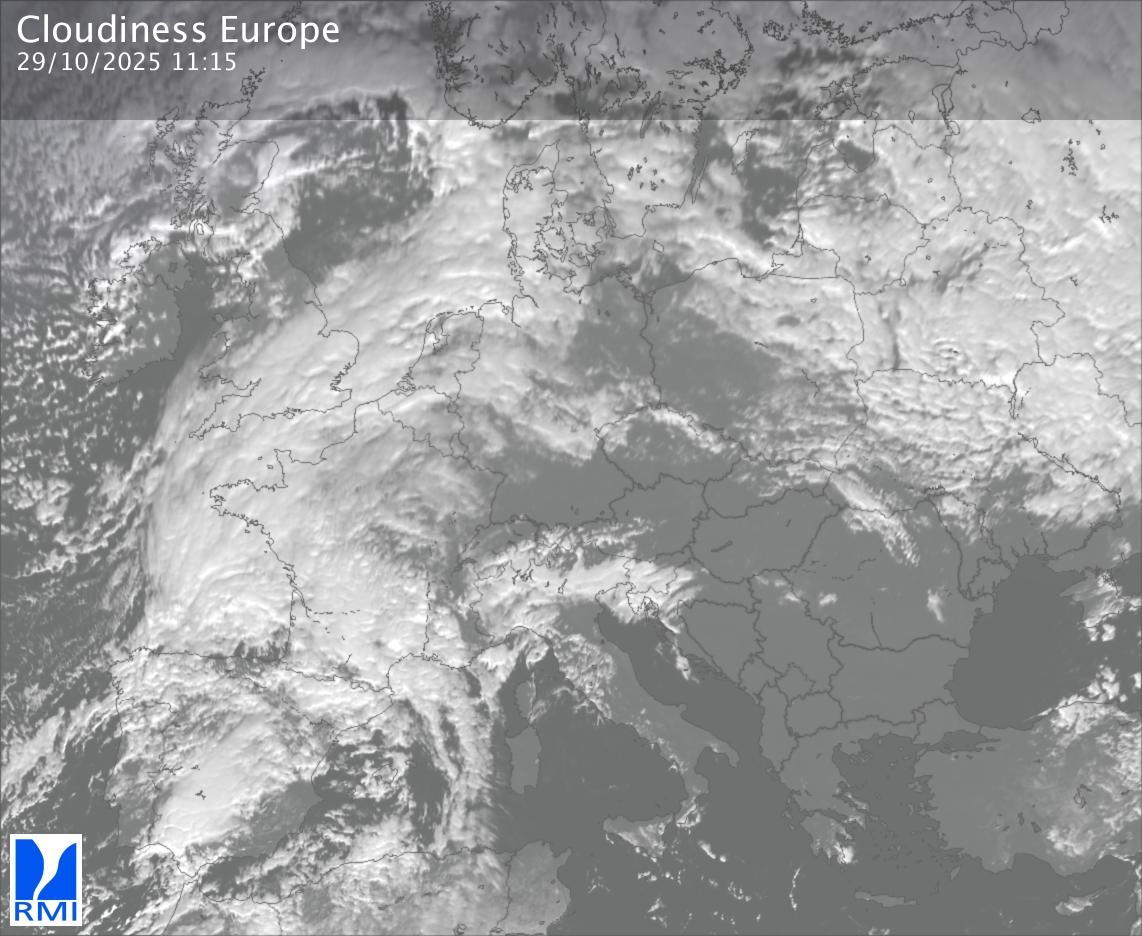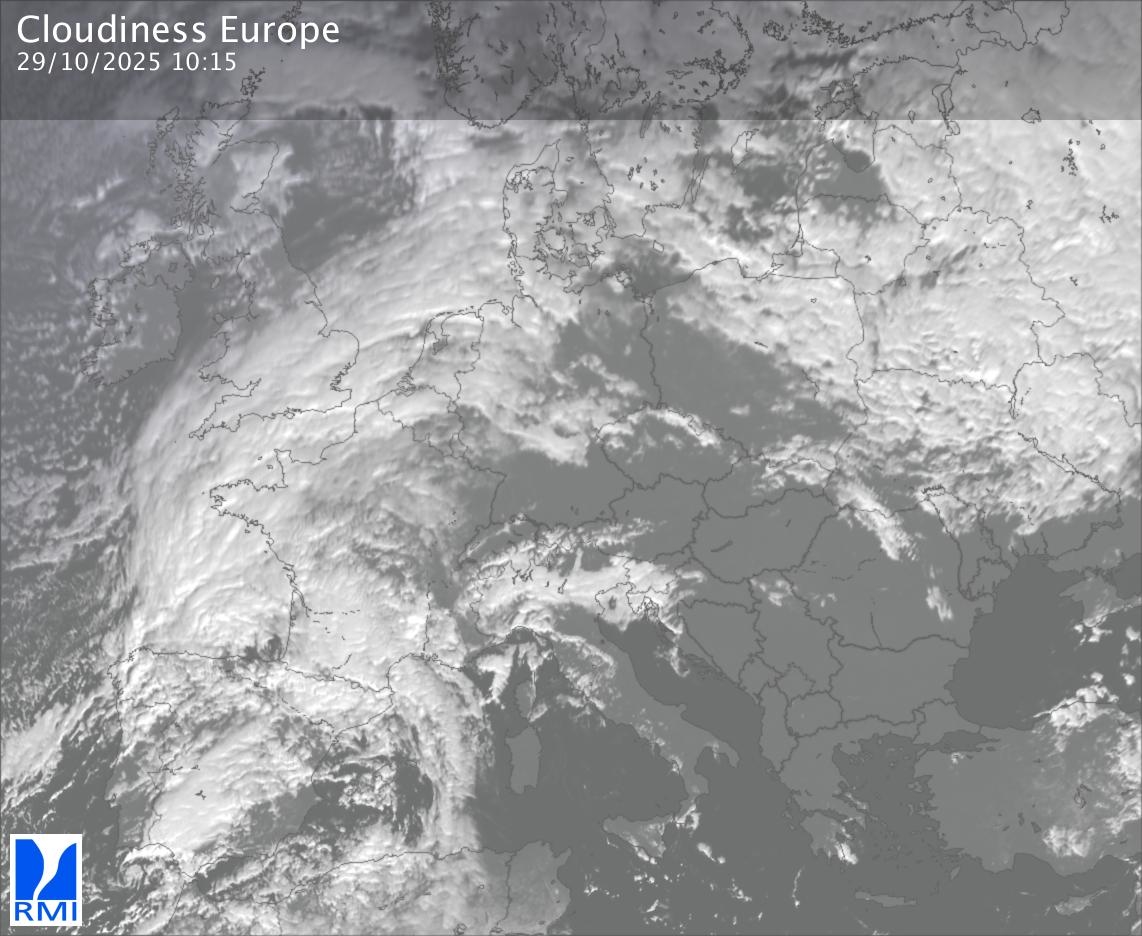 The satellite image of Europe is composed by using both the infrared and the visible light channel from the satellite. Because there are no usable visible light images during the night this composition of channels gives us an image that can be used to observe the clouds by day and by night. The pixelated artifacts are due to the lower resolution of the infrared channel.