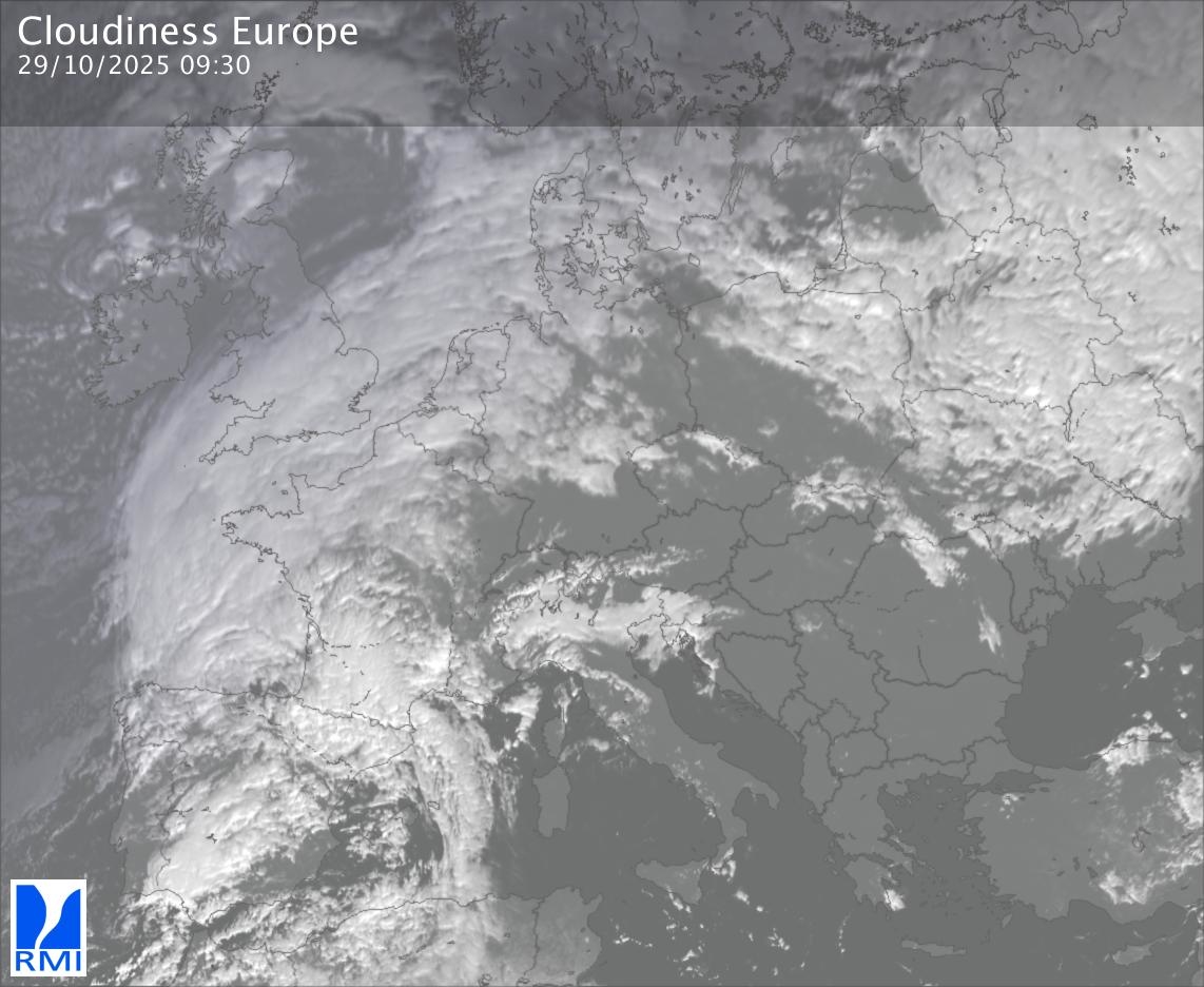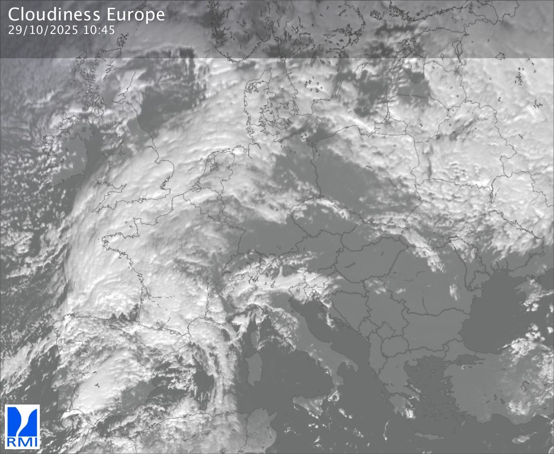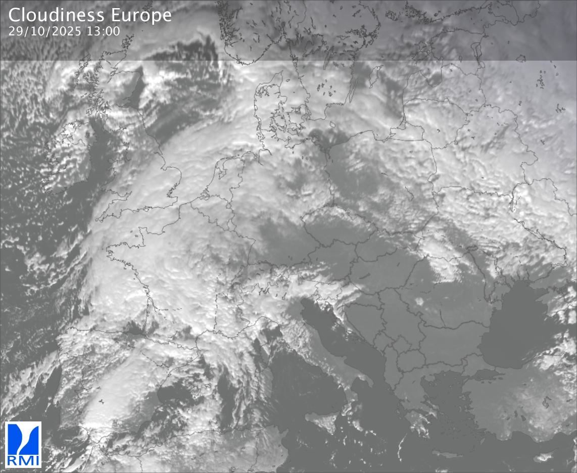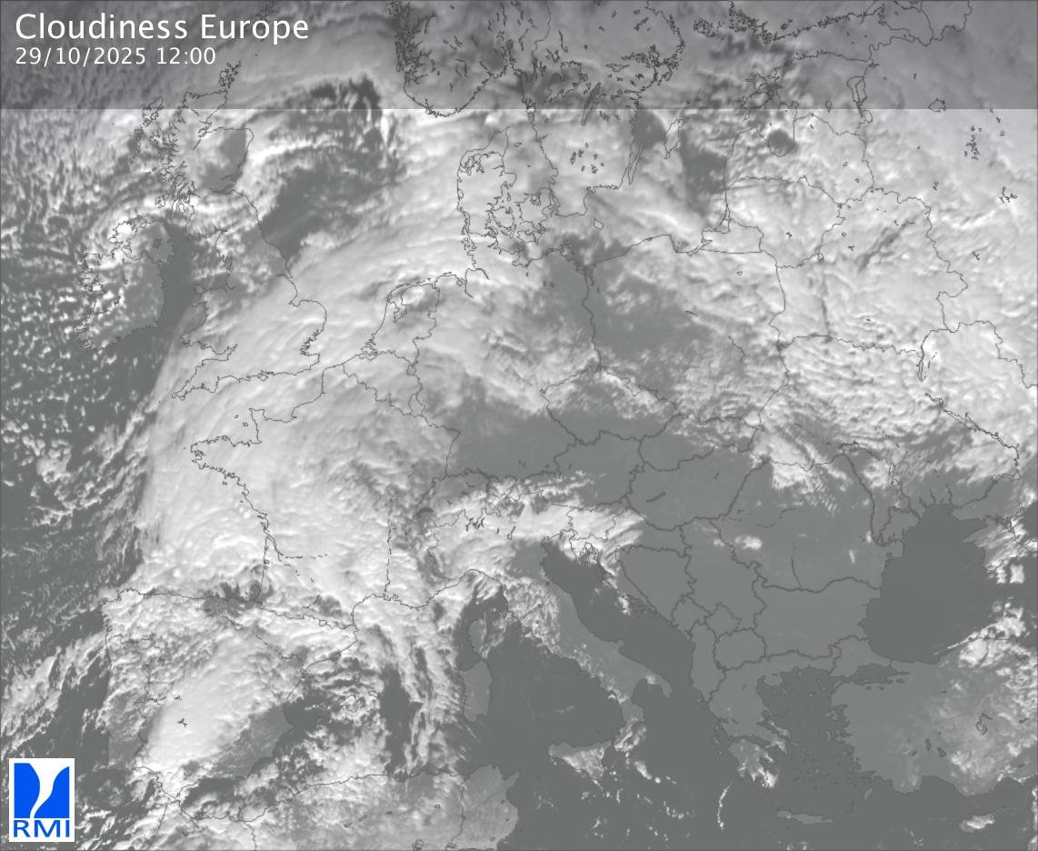 The satellite image of Europe is composed by using both the infrared and the visible light channel from the satellite. Because there are no usable visible light images during the night this composition of channels gives us an image that can be used to observe the clouds by day and by night. The pixelated artifacts are due to the lower resolution of the infrared channel.