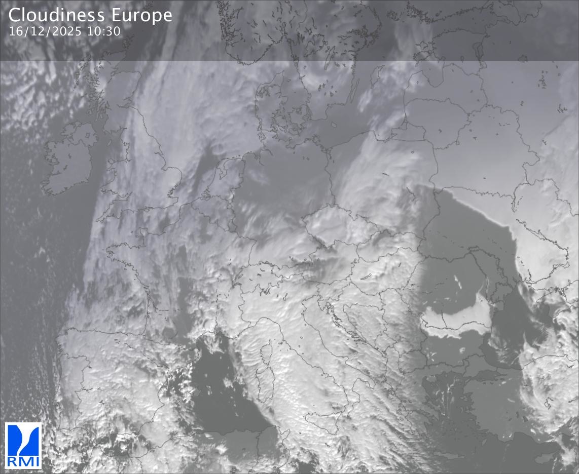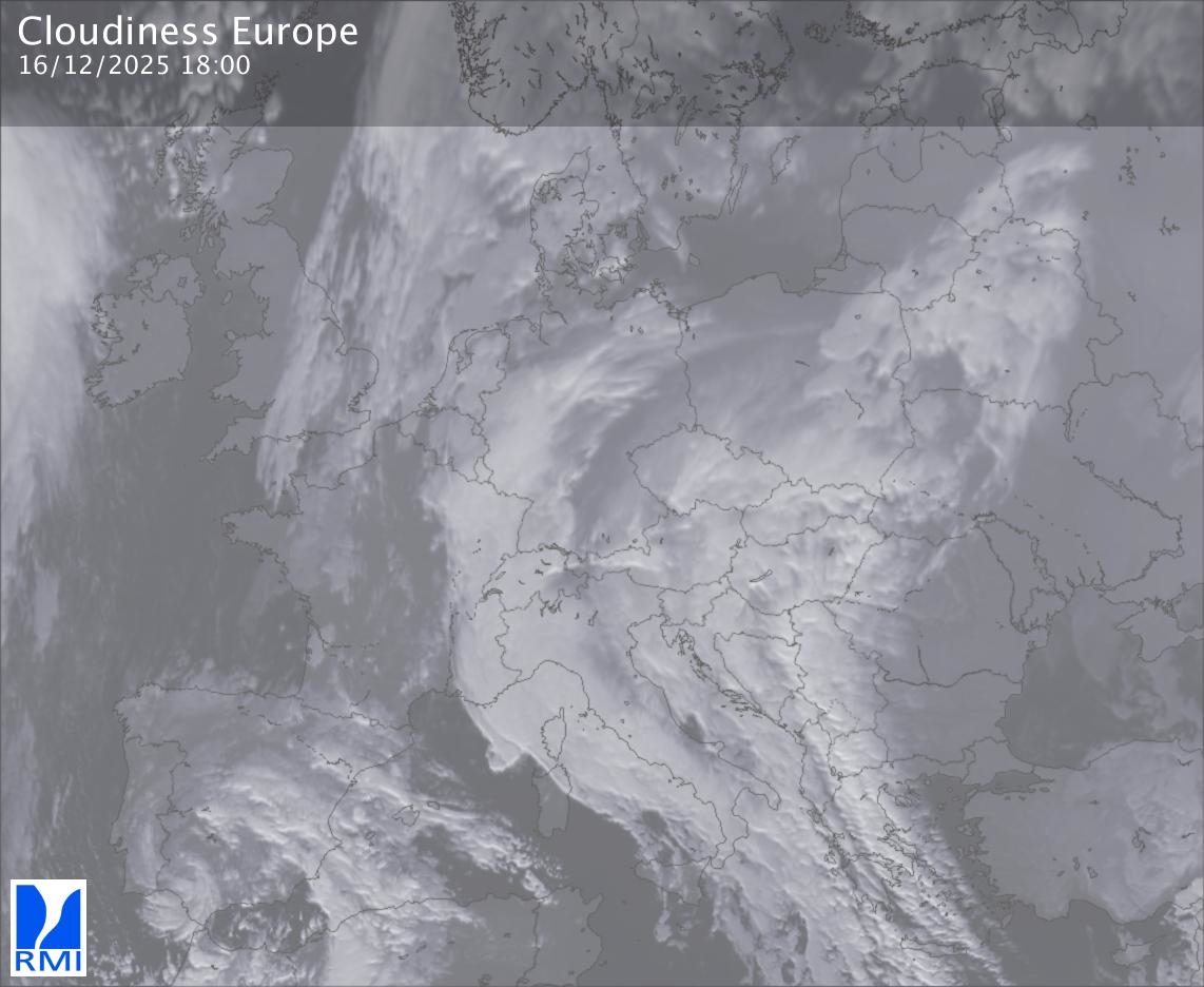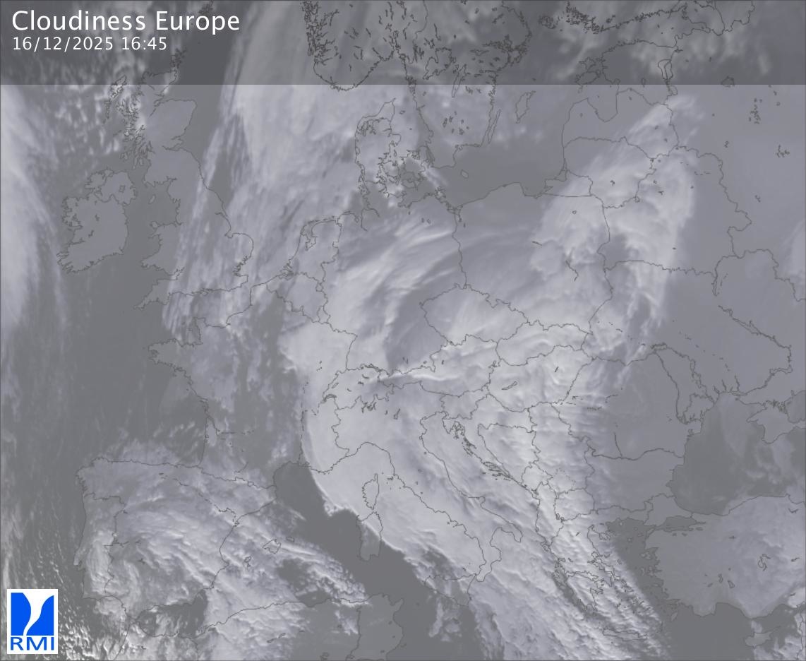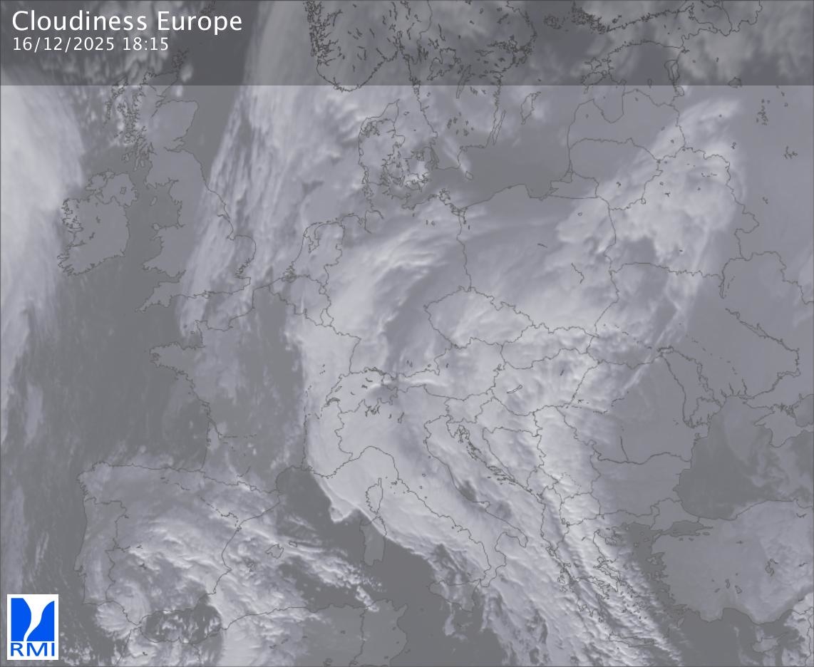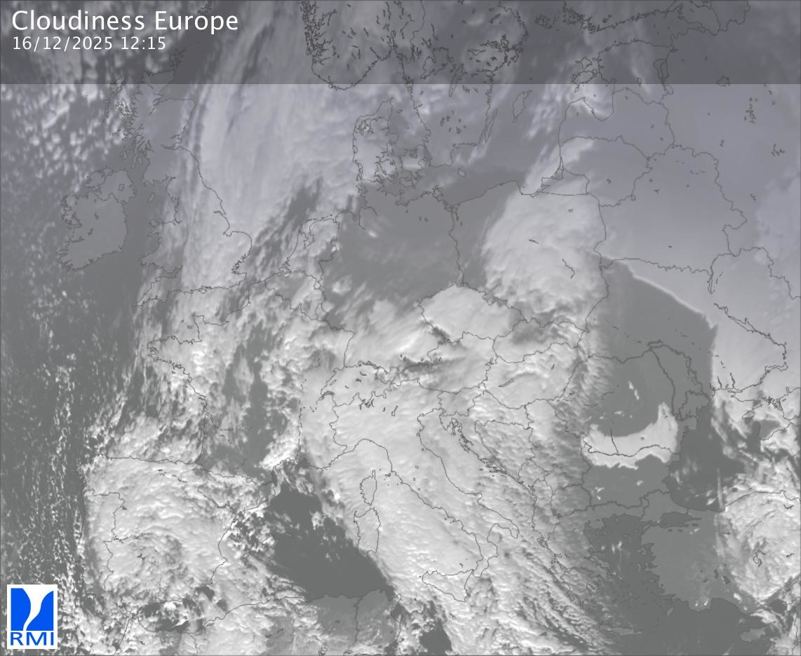 The satellite image of Europe is composed by using both the infrared and the visible light channel from the satellite. Because there are no usable visible light images during the night this composition of channels gives us an image that can be used to observe the clouds by day and by night. The pixelated artifacts are due to the lower resolution of the infrared channel.