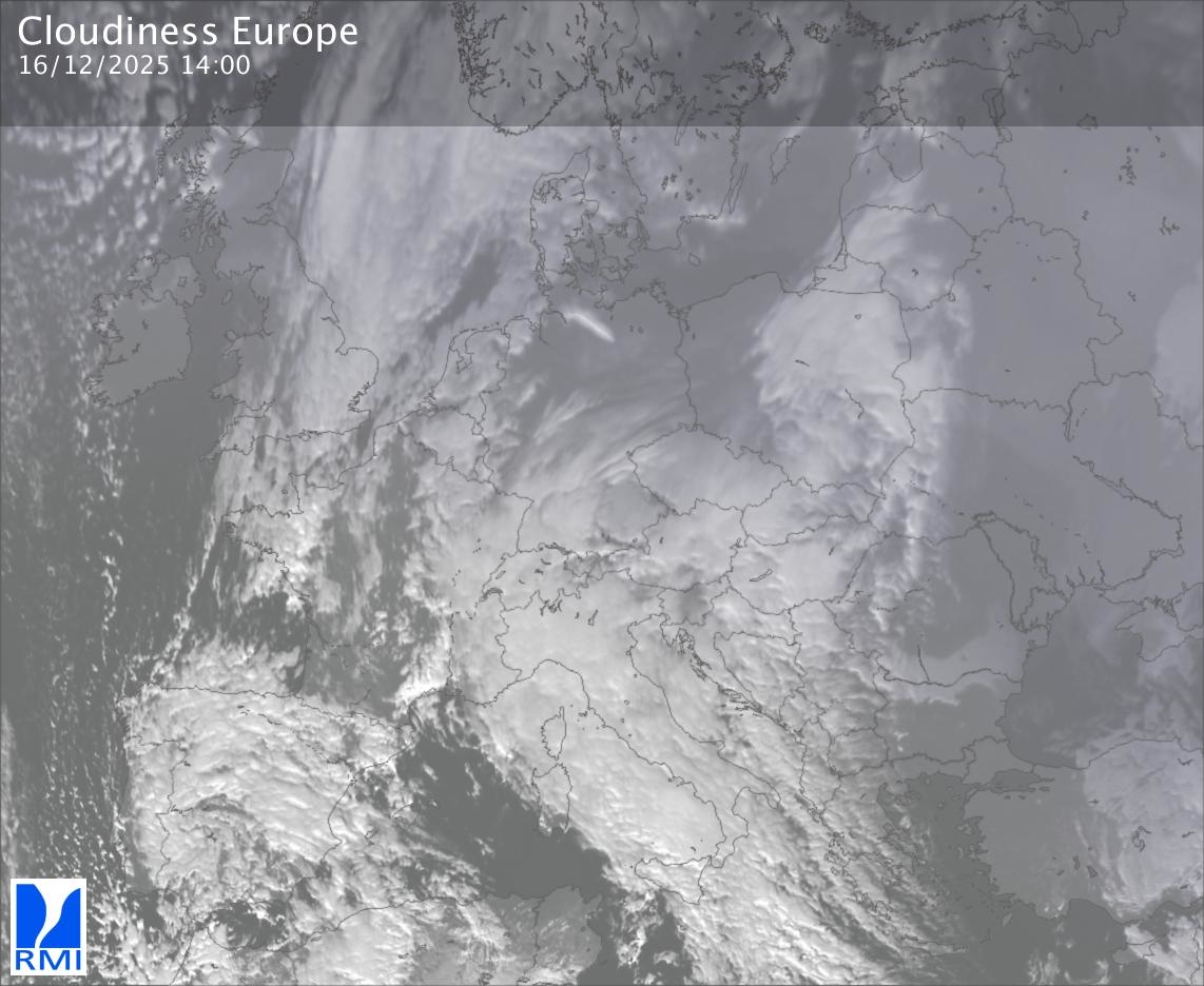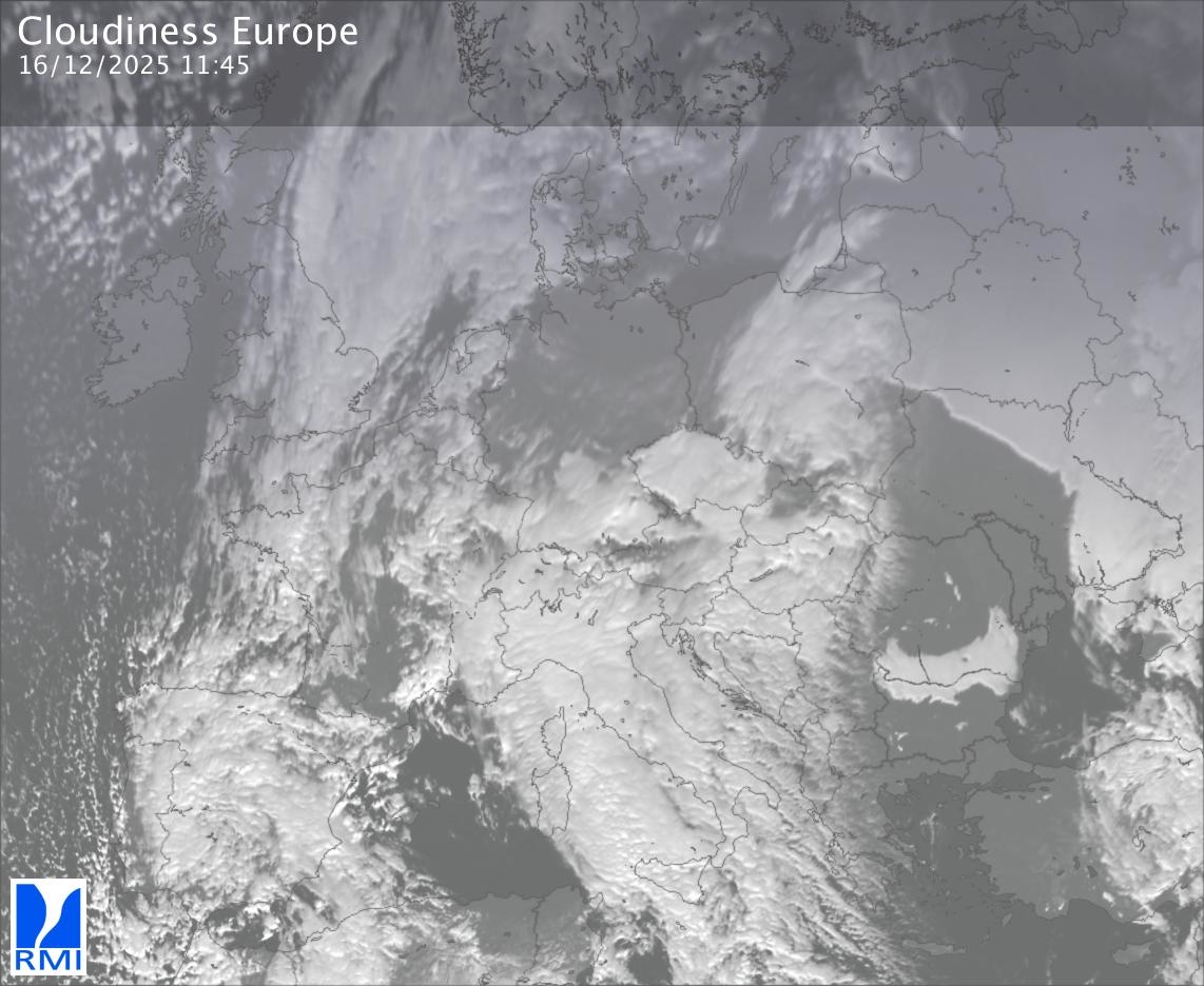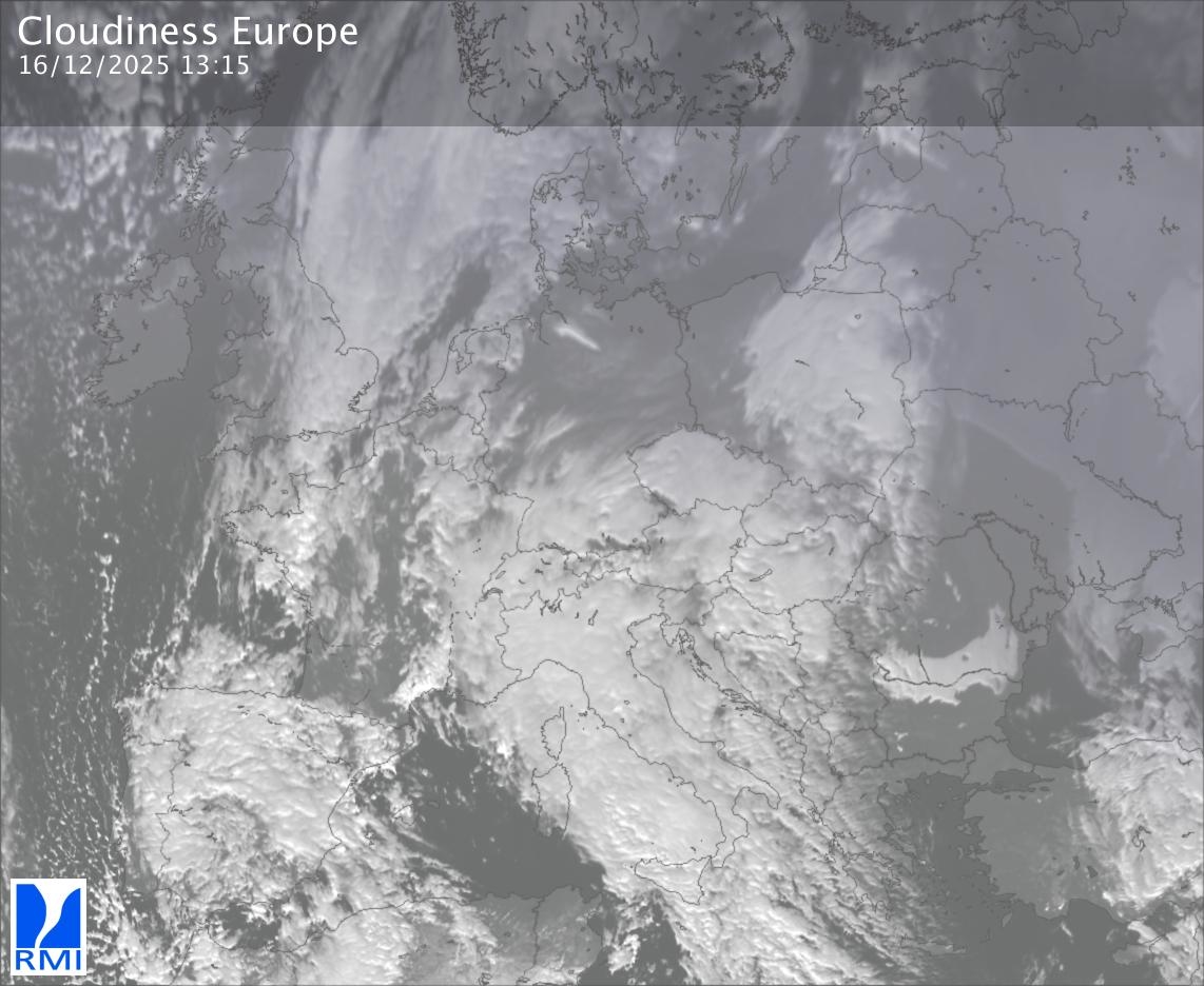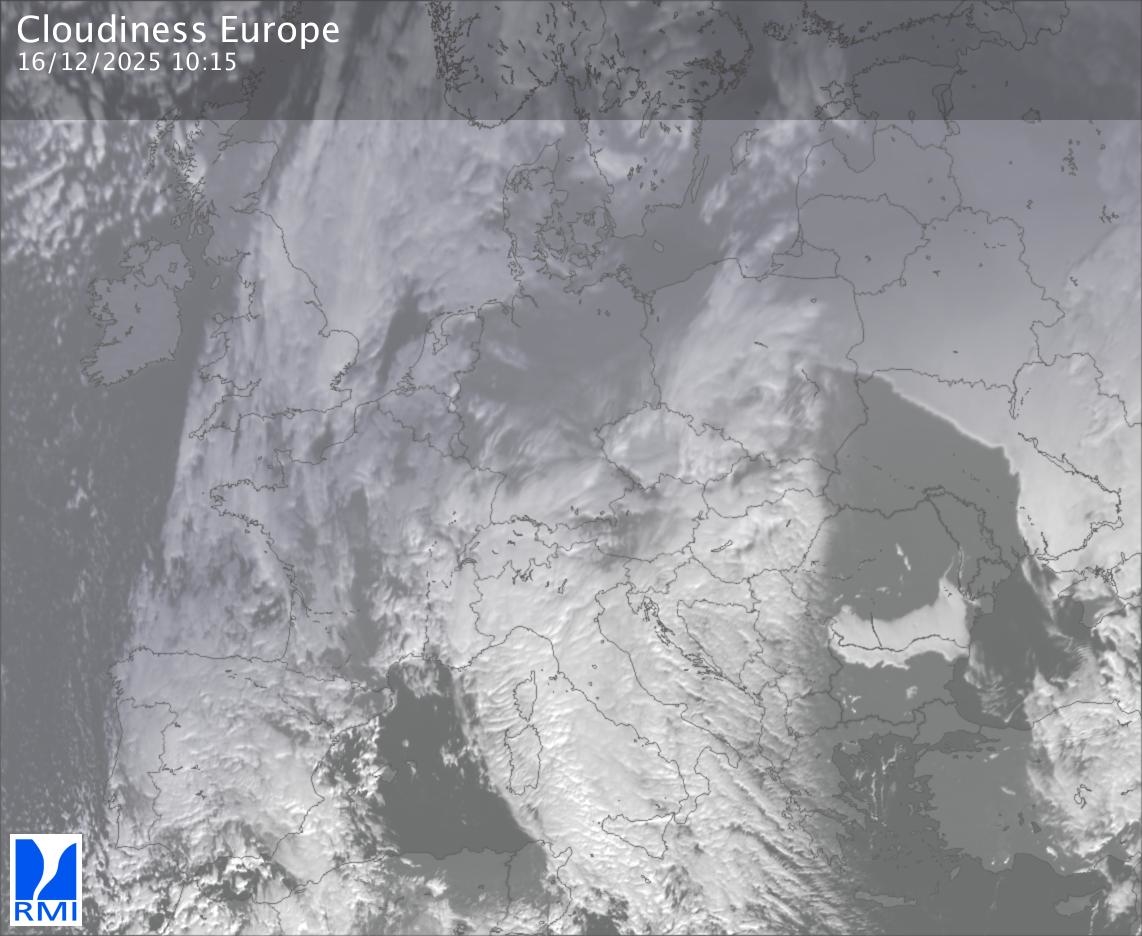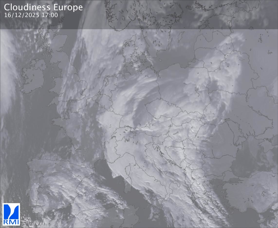 The satellite image of Europe is composed by using both the infrared and the visible light channel from the satellite. Because there are no usable visible light images during the night this composition of channels gives us an image that can be used to observe the clouds by day and by night. The pixelated artifacts are due to the lower resolution of the infrared channel.