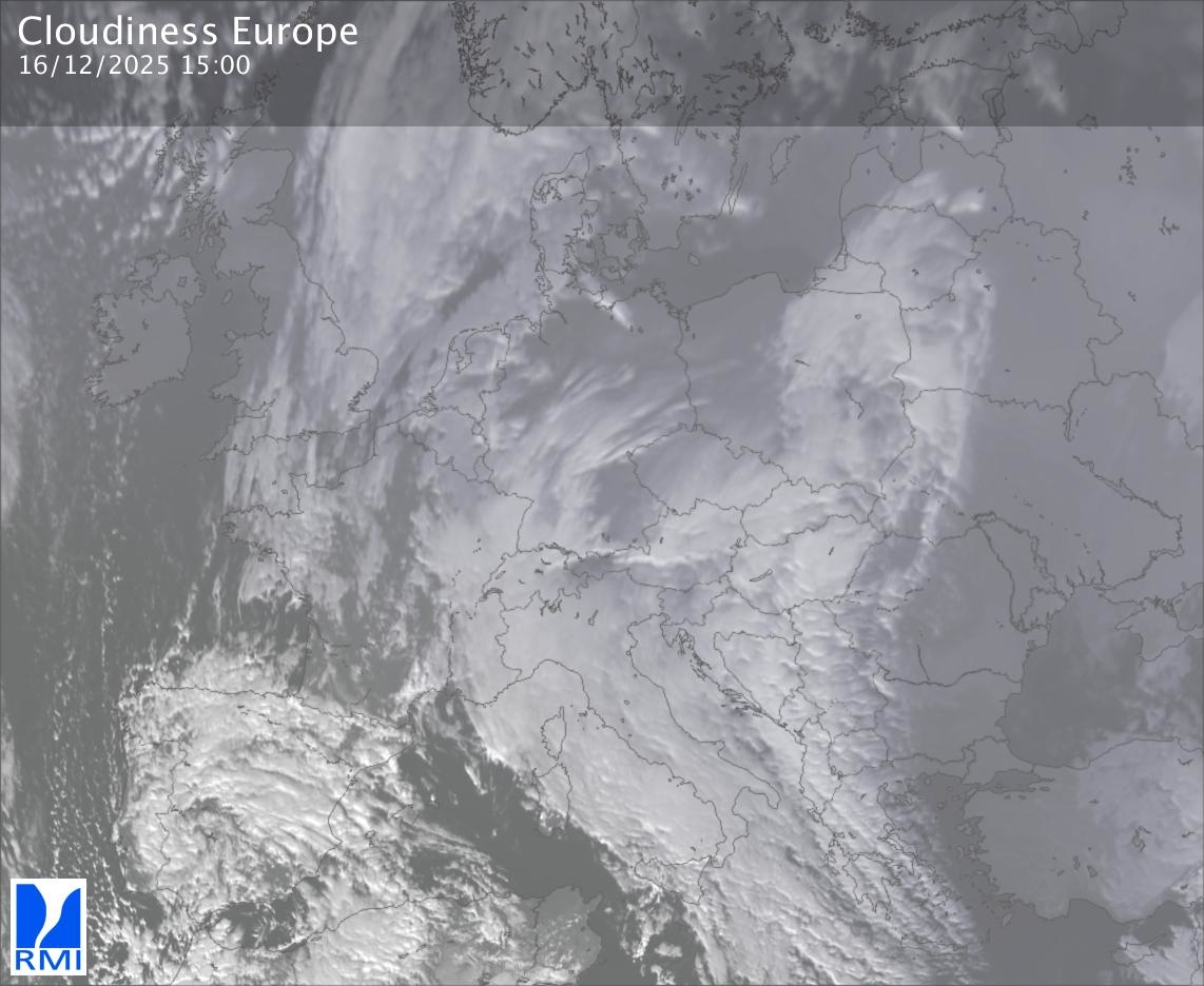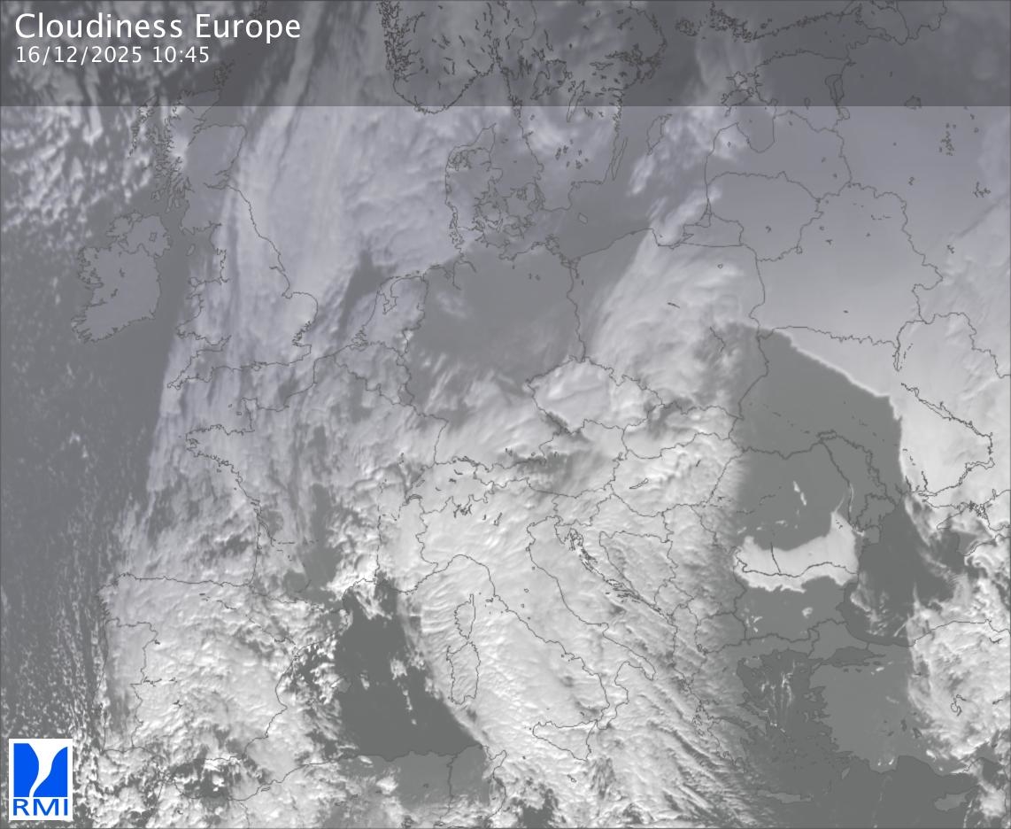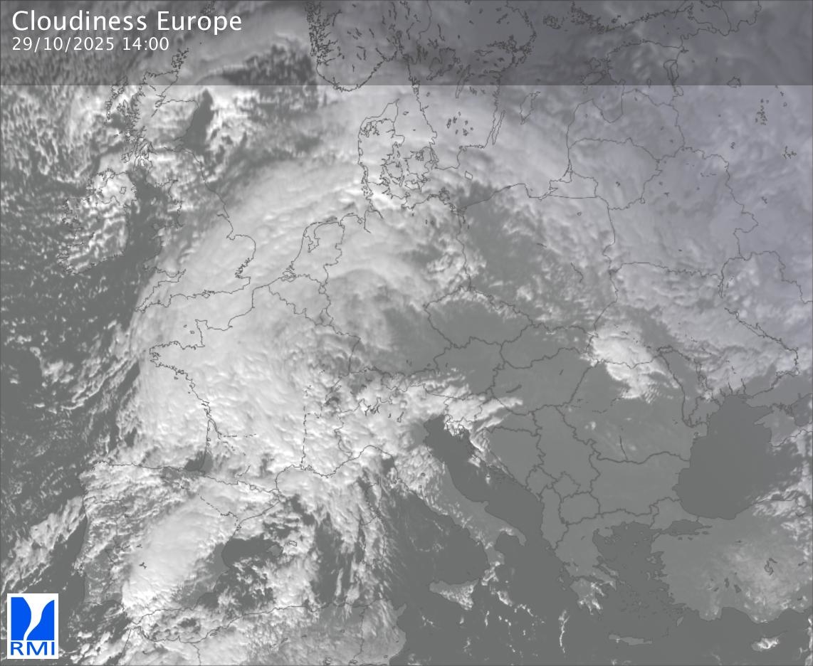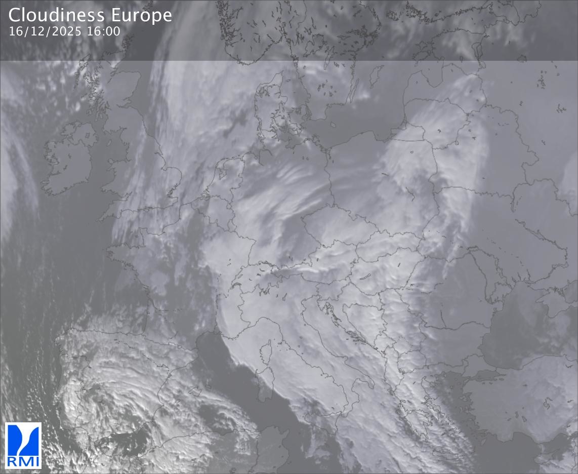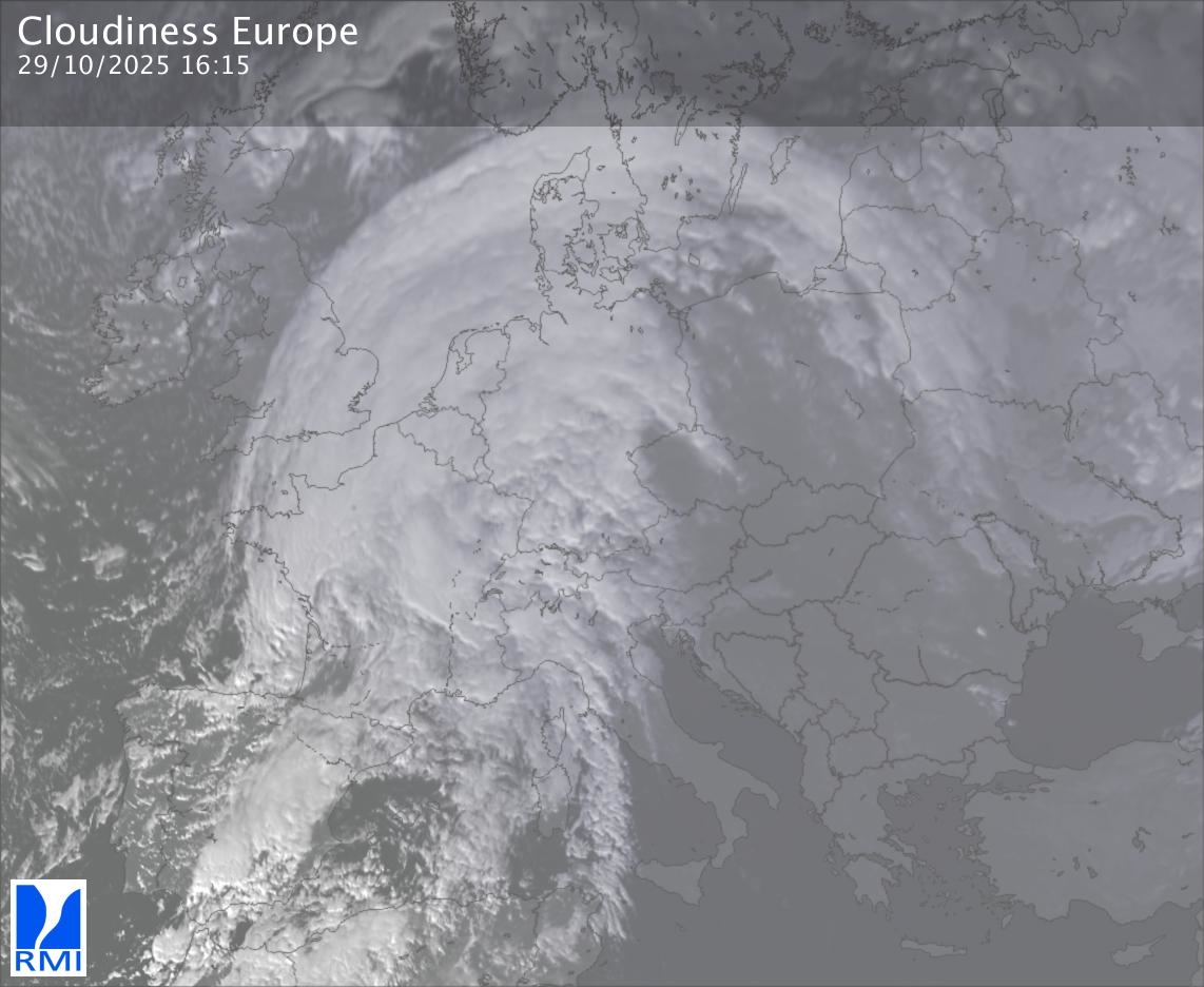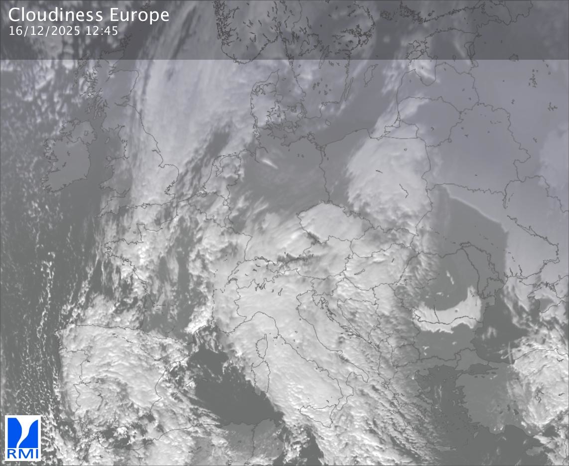The satellite image of Europe is composed by using both the infrared and the visible light channel from the satellite. Because there are no usable visible light images during the night this composition of channels gives us an image that can be used to observe the clouds by day and by night. The pixelated artifacts are due to the lower resolution of the infrared channel.