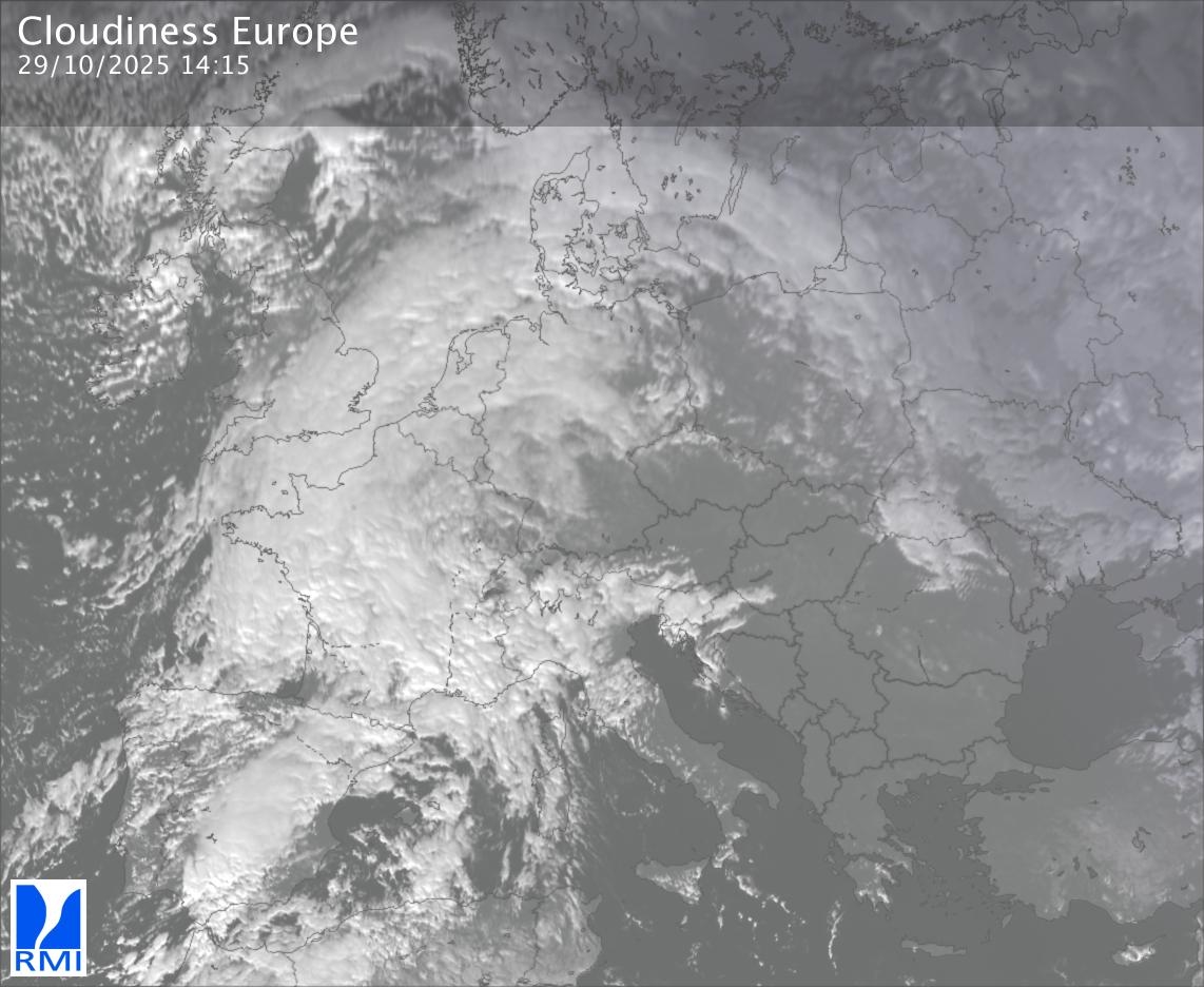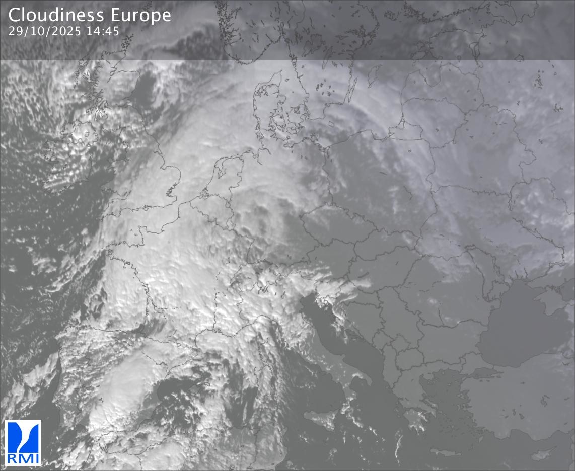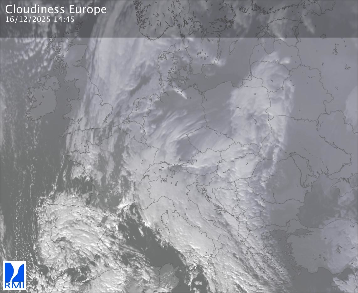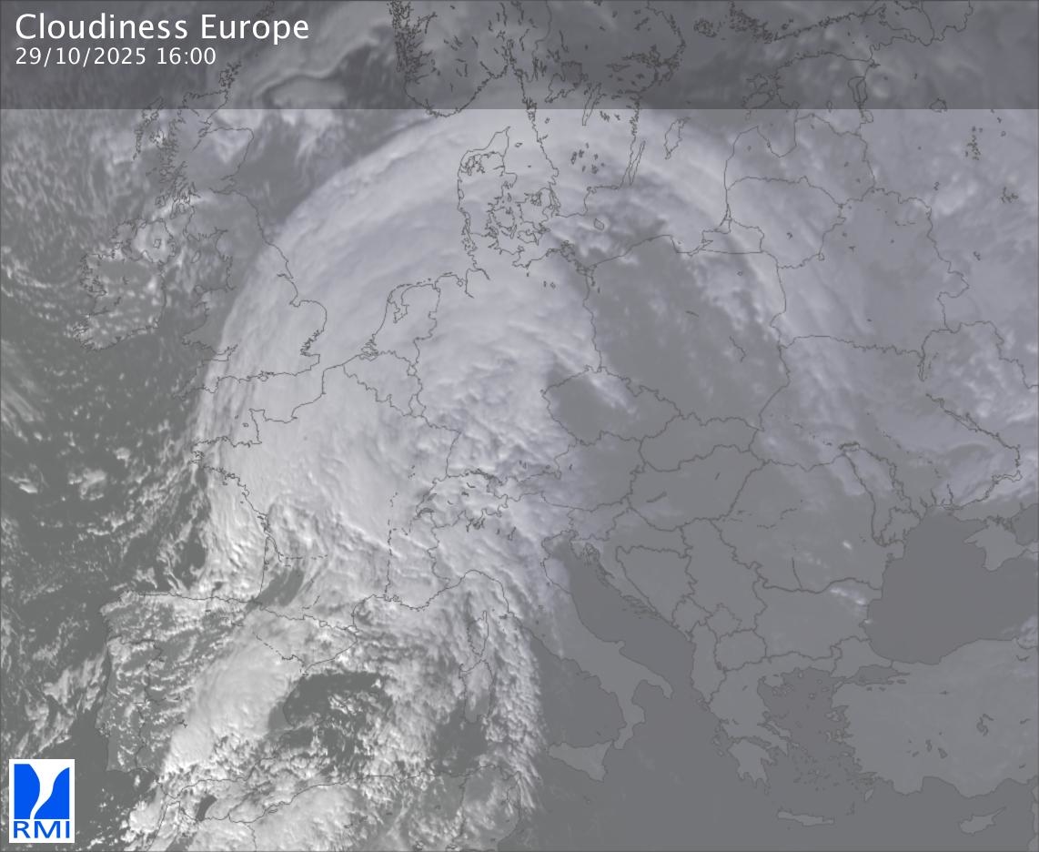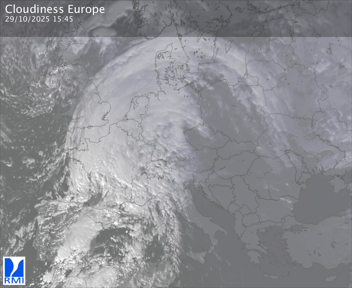 The satellite image of Europe is composed by using both the infrared and the visible light channel from the satellite. Because there are no usable visible light images during the night this composition of channels gives us an image that can be used to observe the clouds by day and by night. The pixelated artifacts are due to the lower resolution of the infrared channel.