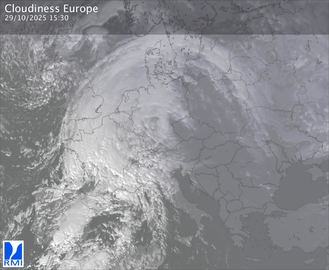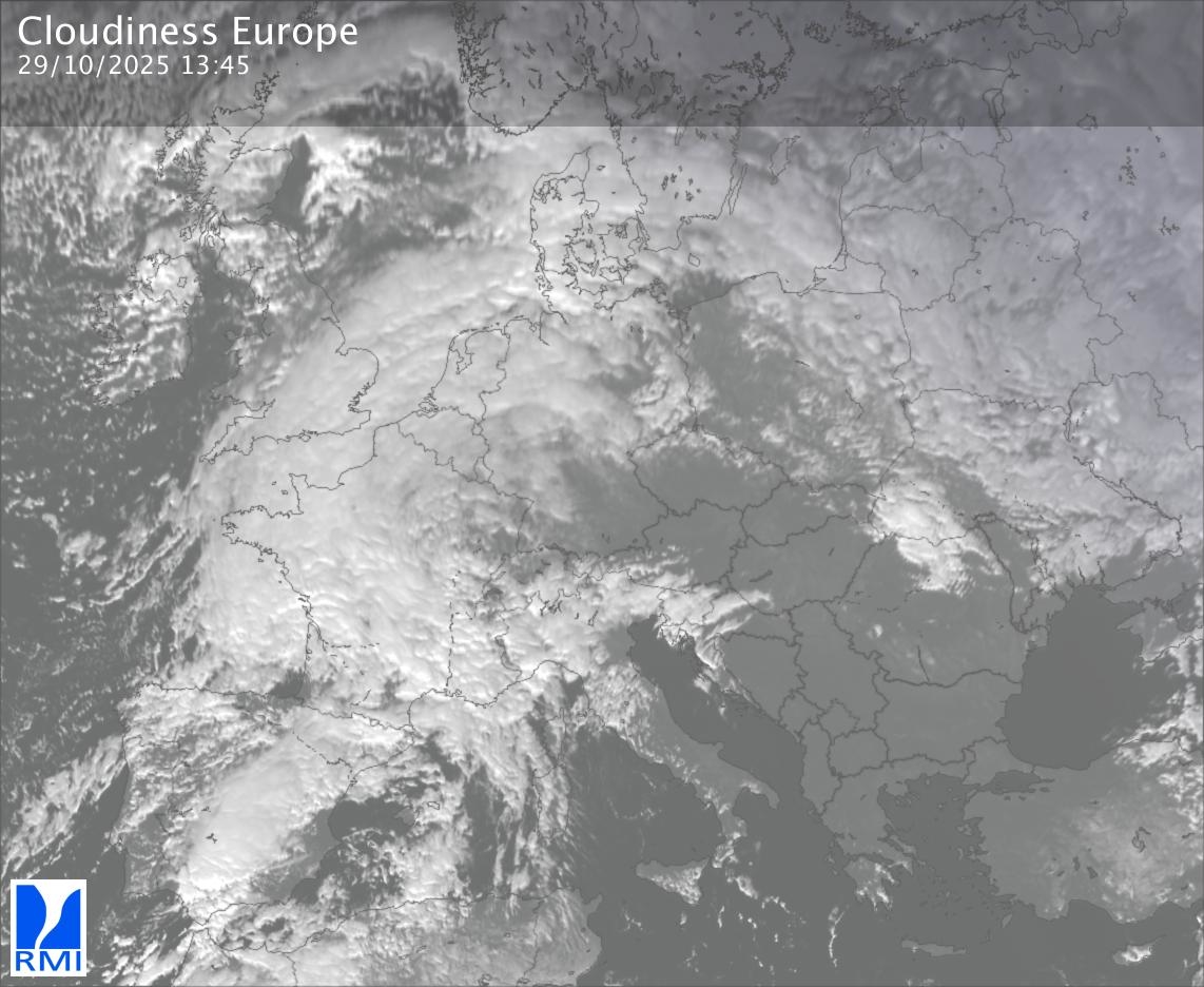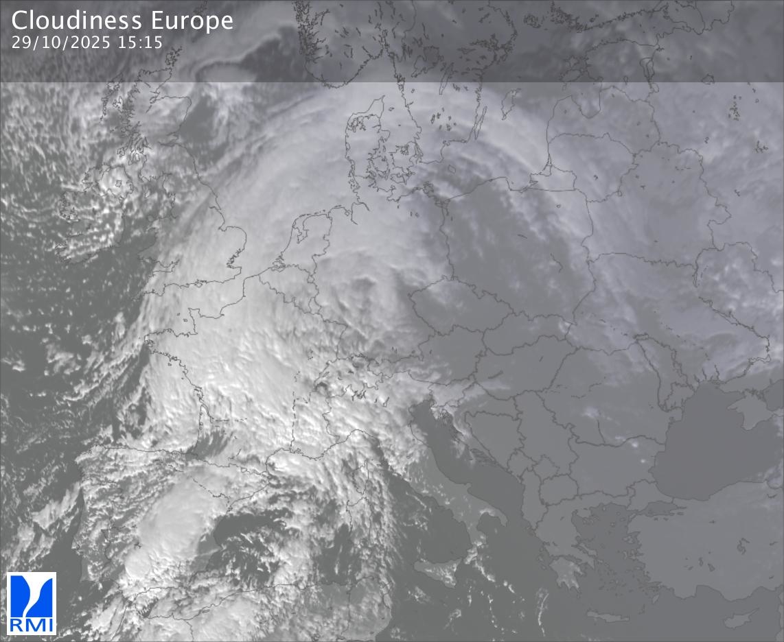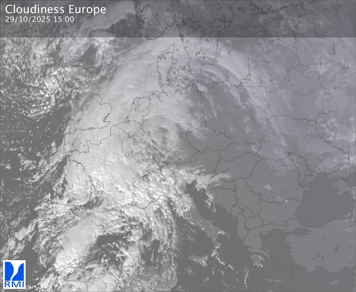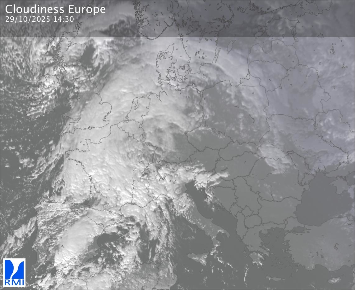 The satellite image of Europe is composed by using both the infrared and the visible light channel from the satellite. Because there are no usable visible light images during the night this composition of channels gives us an image that can be used to observe the clouds by day and by night. The pixelated artifacts are due to the lower resolution of the infrared channel.