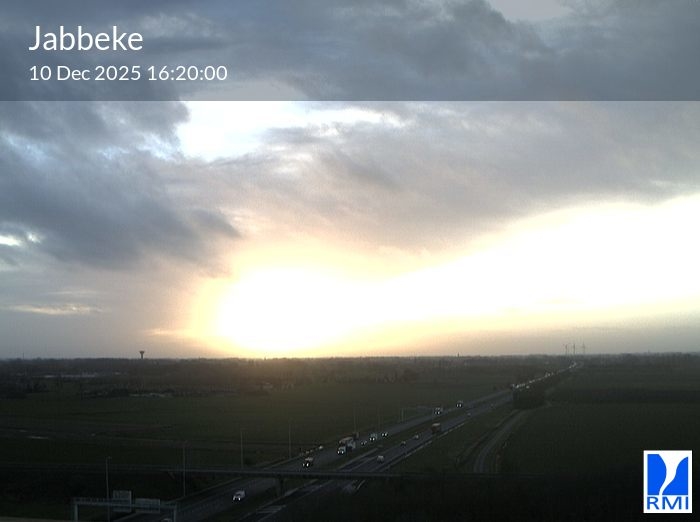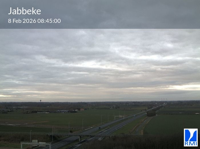 The webcam is located on the tower of the RMI weather radar in Jabbeke at the junction of the E40 highway towards France and the A10 to the coast (Ostend).