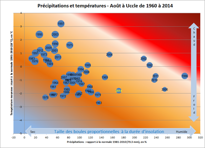 Le dernier mois de l’été météorologique fut caractérisé à Uccle par des déficits très anormal de la température moyenne et un déficit anormal de la durée d’ensoleillement, par un excès très anormal de la vitesse moyenne du vent et par un excès anormal de la quantité de précipitations.