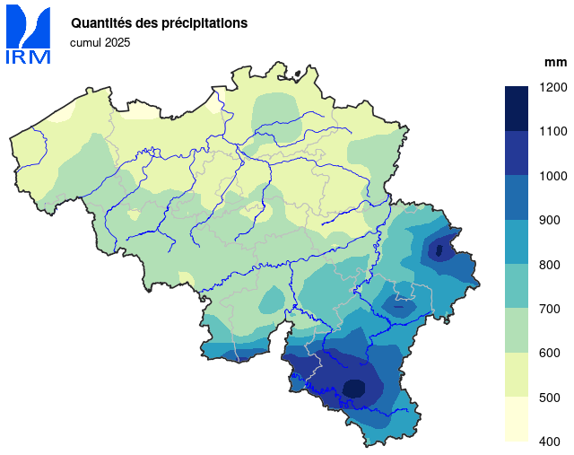 Le reste du pays a également enregistré des précipitations inférieures à la moyenne. Les cumuls annuels ont varié entre 506,1 mm à Stabroek et 1245,5 mm au Mont-Rigi (Waimes).