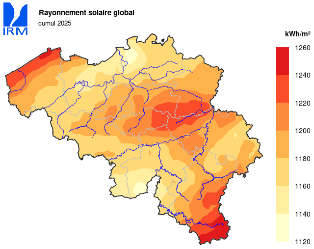 Au total, le soleil a brillé durant 1841 h 04 min (normale : 1603 h 42 min) à Uccle au cours de l'année écoulée, ce qui en fait la quatrième année la plus ensoleillée pour la période de référence actuelle (record : 1283 h 51 min en 1998).
