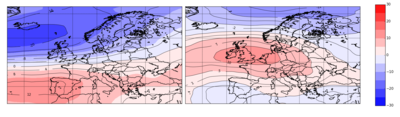 Les zones en rouge (bleu) sur la carte, signifient une position plus haute (basse) que de normal, de l’isobare 500 hPa (anomalie en décamètres). Sur la carte de droite, l’isobare 500 hPa pour la période du 15 mars au 15 avril est plus éleve en moyenne au-dessus de la mer du Nord. C'est le centre du blocage. Source : ECMWF
