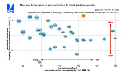 D'après les observations faites à Uccle jusqu'au 18.12.2023 et les prévisions pour le reste de l'année, 2023, avec une température moyenne de 12,1°C, devrait être la troisième année la plus chaude depuis le début des relevés. Les années record restent 2022 et 2020 avec une température moyenne de 12,2°C. Avec une température minimale moyenne de 8,5°C, nous égalons le record absolu établi en 2014.