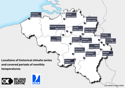 Nous fournissons de longues séries temporelles homogénéisées des températuresmoyennes mensuelles pour 61 stations réparties sur toute la Belgique.
