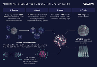Ce mardi 1er juillet 2025, le Centre Européen pour les Prévisions à Moyen Terme (ECMWF) a lancé la première version de modèle probabiliste du système de prévisions par intelligence artificielle (AIFS). Le modèle AIFS ENS v1 fourni des prévisions d’ensemble et tourne en parallèle avec le modèle physique traditionnel Integrated Forecasting System (IFS), pour faire progresser les prévisions météorologiques numériques. Ce modèle d’ensemble de haute précision vient compléter le portfolio de services d’ECMWF en utilisant les opportunités offertes par le machine learning et l’intelligence artificielle. Le modèle AIFS ENS ne fourni pas seulement une prévision , il fourni également une estimation de l’incertitude de celle-ci.