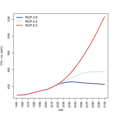 Afin d'étudier le changement de climat, une première simulation par modèle pour une période historique (1950-2005) a été effectuée, suivie par des projections climatiques calculées sur la période 2006-2100. Ces simulations ont été calculées pour trois scénarios différents d'émission de gaz à effet de serre. L'évolution des concentrations des gaz à effet de serre, représentés dans ces trois scénarios appelés Representative Concentration Pathways (RCP), sont décrites à la figure ci-dessous : (i) une forte augmentation (RCP 8.5, en rouge), (ii) une augmentation suivie d'une stabilisation graduelle (RCP 4.5, en bleu clair), et (iii) une augmentation suivie d'une diminution de ces concentrations d'ici la fin de ce siècle (RCP 2.6, en bleu foncé).