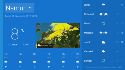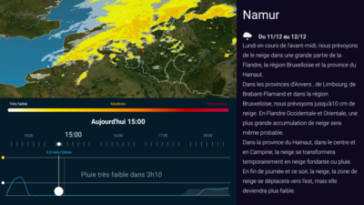 Avec votre télécommande, sélectionnez l’image du radar, et visualisez les zones de précipitations en temps réel ainsi que leur déplacement dans les prochaines heures, sans oublier nos avertissements !