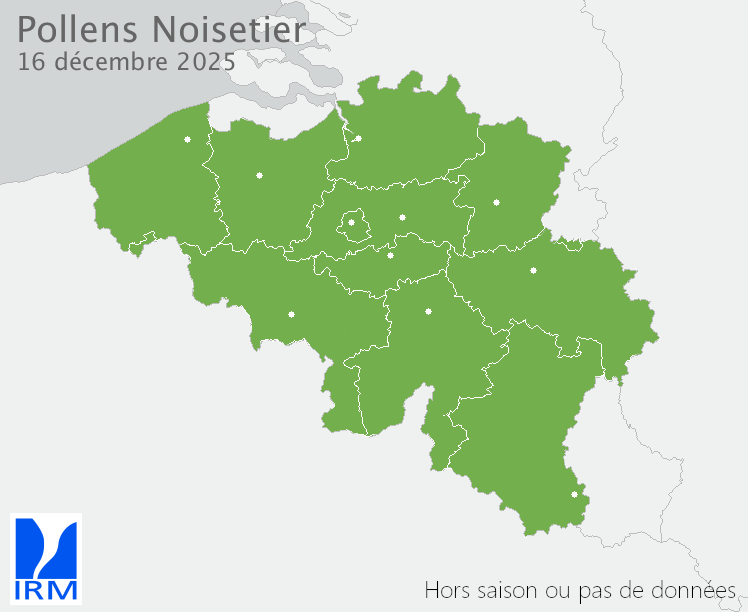 NulAucun grain de pollen n'est attendu dans l'air. Le risque de symptômes est théoriquement absent, bien qu'une exposition très locale puisse déclencher des allergies.