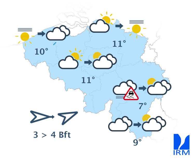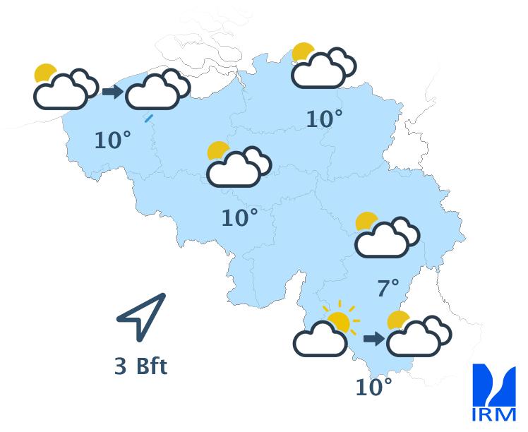 Jeudi, le ciel sera assez nuageux. Le temps restera souvent sec, mais en cours de journée, le risque d'une averse augmentera. Les maxima se situeront entre 8 et 12 degrés. Le vent sera faible à modéré de secteur sud-ouest.