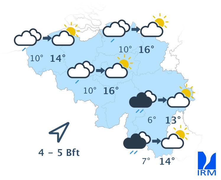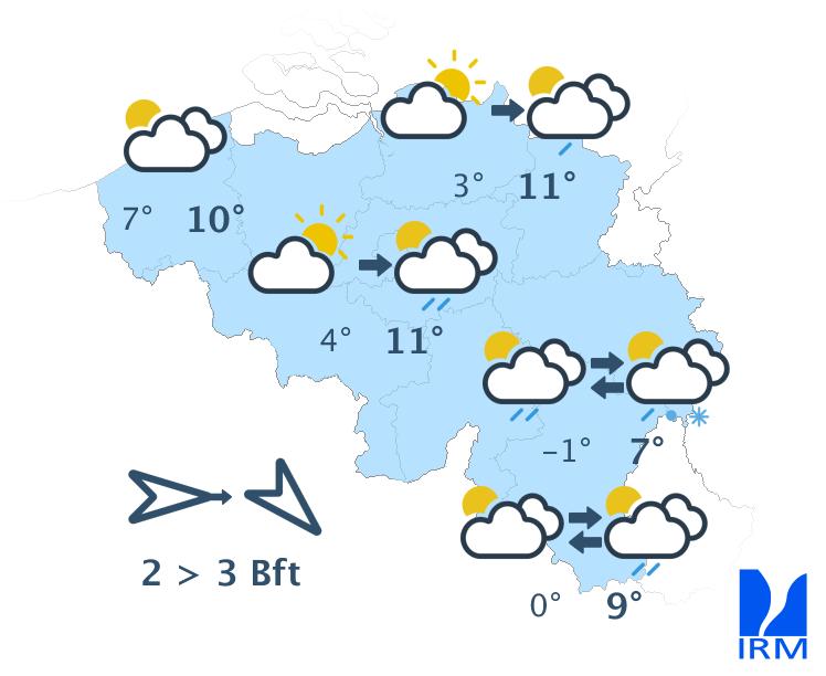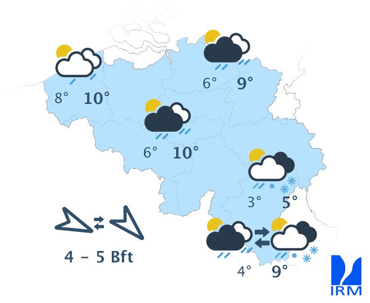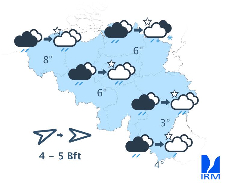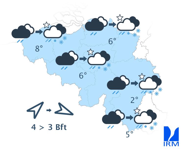 Mardi, le ciel sera variable à très nuageux, avec des averses ou des giboulées délivrant localement du grésil. Nous prévoyons ces précipitations surtout dans le centre et l'est. Dans l'après-midi, le temps plus sec présent sur l'ouest gagnera également le centre. Les températures maximales se situeront toujours entre 5 et 11 degrés, avec un vent modéré de nord-ouest.