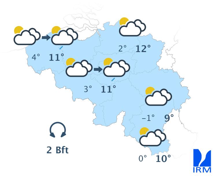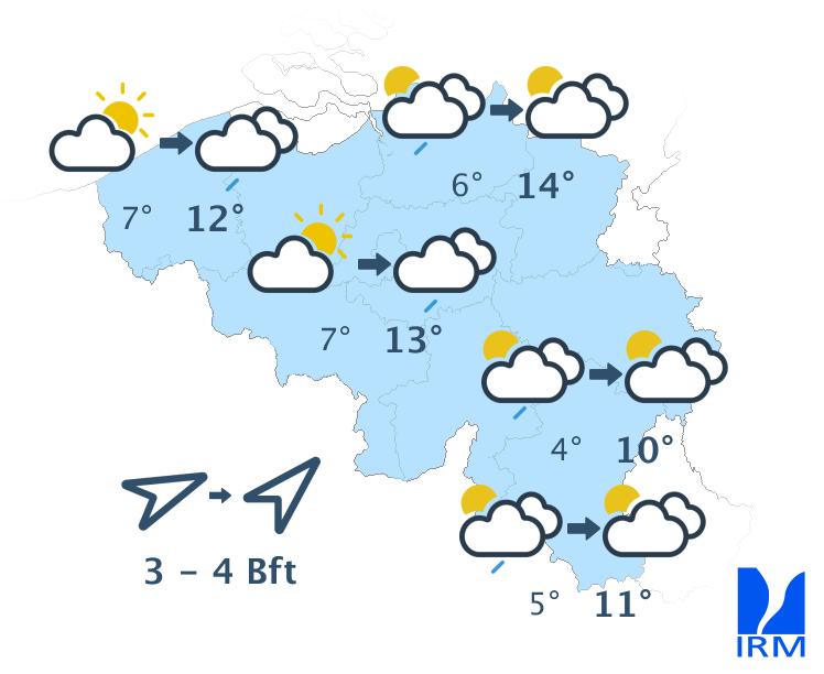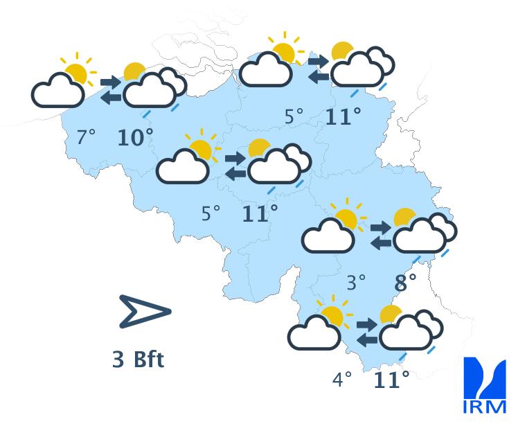 Mercredi, la journée commencera avec beaucoup de nuageux. Ensuite, le temps sera marqué par une alternance d'éclaircies et de passages nuageux. Une averse n'est pas exclue mais de manière isolée. Le temps restera donc sec dans la plupart des régions, avec des maxima entre 6 et 12 degrés. Le vent sera faible à parfois modéré, soufflant du nord au nord-est ou de direction variable.