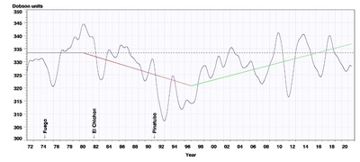 De gegevens van de Brewer instrumenten worden gebruikt om de evolutie van de ozonlaag op lange termijn in het oog te houden. Dit is onder andere belangrijk om na te gaan of het protocol van Montreal voor de bescherming van de ozonlaag effectief gehandhaafd wordt. De figuur hierna toont de evolutie van de jaargemiddelden te Ukkel over de waarnemingsperiode. Naast de natuurlijke schommelingen zijn ook de invloed van enkele vulkaanuitbarstingen duidelijk zichtbaar. Tevens wordt de trend over verschillende periodes weergegeven. Die bedraagt -0.24% per jaar in de periode 1980-1996. De ozonafbraak in de stratosfeer is een gevolg van de aanwezigheid van chloorverbindingen in de atmosfeer op grote hoogte afkomstig van het gebruik van chloorfluorkoolwaterstoffen (Cfk’s). De concentratie daarvan in de atmosfeer piekte rond 1997 en nam daarna geleidelijk af, na het wereldwijd verbod op de productie van deze stoffen. Hierdoor kon de ozonlaag zich geleidelijk herstellen met +0.20% per jaar in de periode 1997-2021.