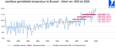 Vanaf vandaag (25 januari 2021) zijn de nieuwe klimaatnormalen voor Ukkel beschikbaar. Deze werden berekend voor de meest recente 30-jarige periode 1991-2020.