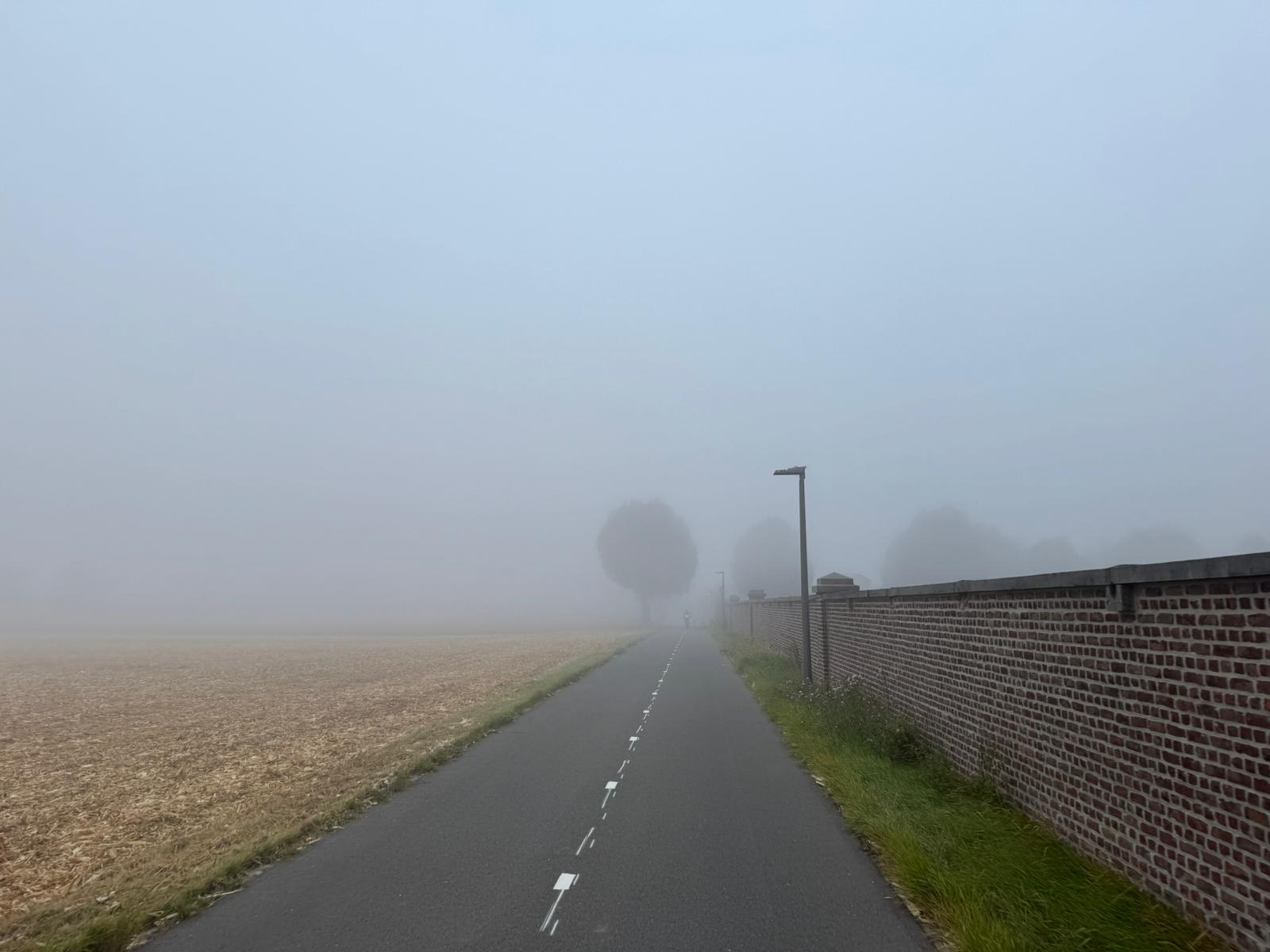 - Gele waarschuwing: plaatselijke mist, zicht < 200 m (soms < 50 m). Voorzichtig op de weg.