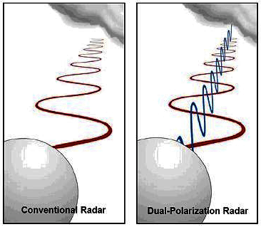 Hoe werkt die dubbele polarisatie nu precies? Een single-polarisatieradar zendt zijn elektromagnetische puls uit in één vlak: het horizontale. Een dual-pol radar zendt tegelijkertijd twee pulsen uit: één in het horizontale en één in het verticale vlak. Ook het ontvangst van het weerkaatste signaal gebeurt afzonderlijk in de twee polarisaties. Doordat verschillende neerslagtypes (regen, sneeuw, hagel, ...) verschillende vormen aannemen, zullen verschillende types neerslag een ander signaal geven in de twee polarisaties.