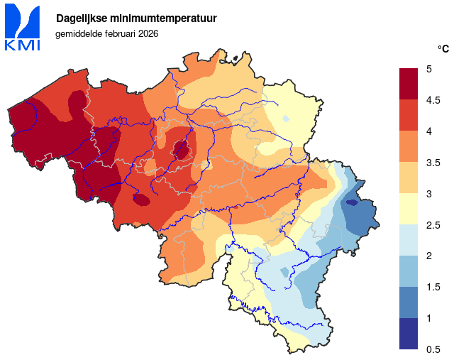 In ons land werd de laagste minimumtemperatuur op 15 februari in Mont-Rigi (Weismes) gemeten met -7,8°C. De hoogste temperatuur werd op de 25ste in Kapelle-op-den-Bos