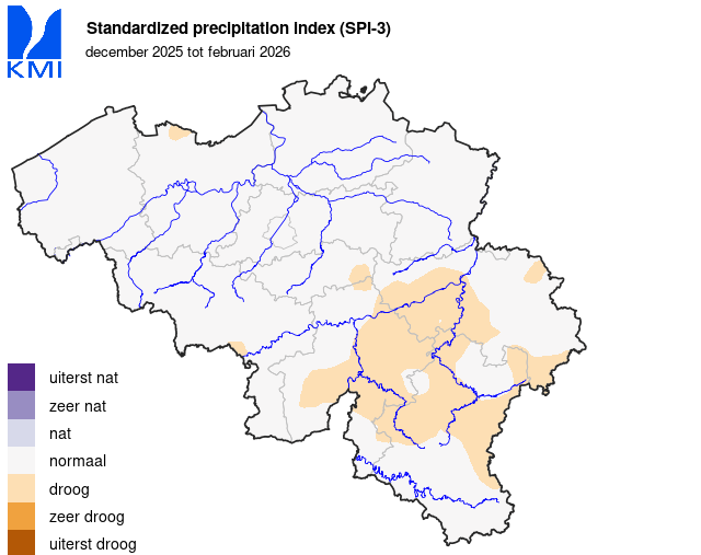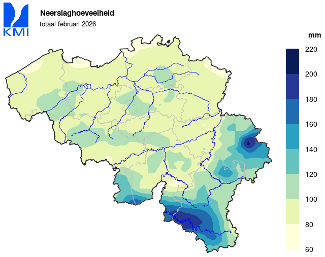 In het klimatologisch meetnet van het KMI werd het grootste dagtotaal op 11 februari gemeten. In Sugny (Vresse-sur-Semois) viel er toen 38,3 mm.
