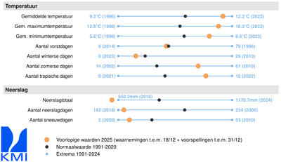 Op dit moment (data t.e.m. 18/12/2025) bedraagt de gemiddelde temperatuur van 2025 te Ukkel 12,3°C. Daarmee ligt de gemiddelde temperatuur op dit moment nog 0,1°C boven het absolute record van 2020 en 2022. Met nog 13 dagen voor de boeg, waarbij vanaf 22 december een daling in de temperaturen in het verschiet ligt, is de kans echter groot dat de gemiddelde temperatuur nog zal zakken. Met de huidige voorspellingen voor de rest van het jaar, zouden we op een gemiddelde temperatuur van 12,0°C uitkomen (normaal: 11,0°C). Daarmee zou 2025 op een gedeelde vierde plaats in het totale klassement (sinds 1833) uitkomen.