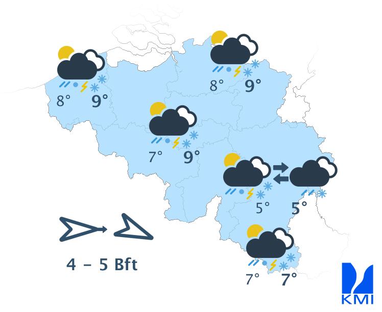 Woensdag wordt een wisselvallige en gure dag met maartse buien. De buien kunnen fel zijn en gepaard gaan met onweer en korrelhagel, in de Ardennen ook (natte) sneeuw die afhankelijk van de intensiteit eventueel kan blijven liggen. Het wordt gevoelig frisser met maxima tussen 4 graden in de Hoge Venen en 8 à 9 graden in Vlaanderen. De wind waait in het binnenland matig tot vrij krachtig uit west tot noordwest en en zee krachtig tot zeer krachtig uit noordwest. Er treden rukwinden op tussen 60 en 85 km/h.