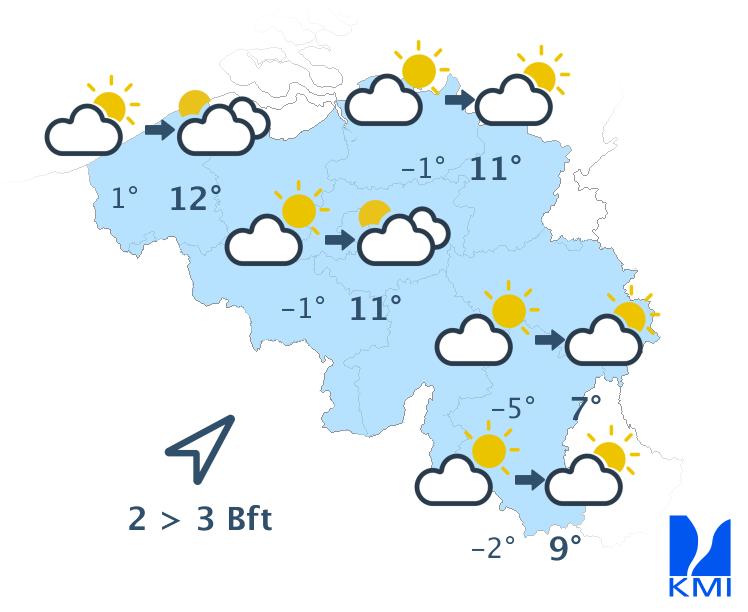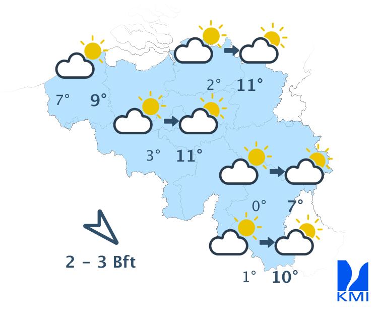 Zondag wordt het, na een koude nacht, eerst vrij zonnig. In de loop van de dag ontwikkelt er zich stapelbewolking maar het zou droog blijven. De maxima schommelen van 7 tot 11 graden bij een zwakke tot matige wind uit noordwest.