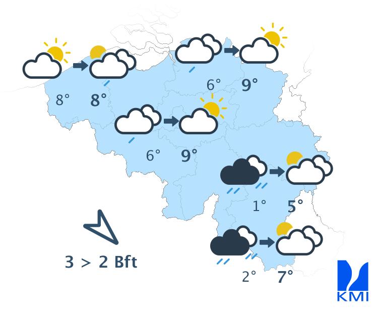 Zaterdag trekt een regenzone verder oostwaarts over ons land om uiteindelijk weg te trekken richting Duitsland. In de namiddag volgen er opklaringen vanaf de kust. De maxima liggen tussen 5 en 9 graden. Na de regenzone draait de wind naar noordwest.
