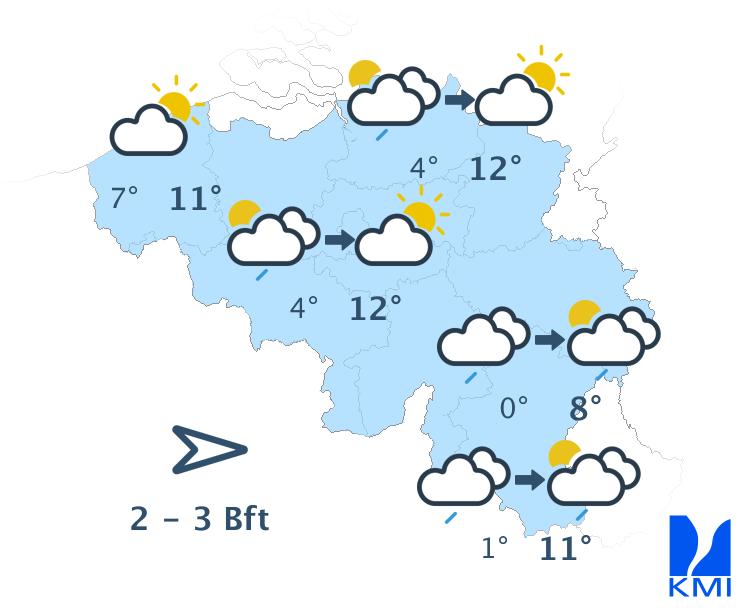 Donderdag begint de dag met lokale gladheid. Overdag blijft het koud en wisselvallig met maartse buien. In de Ardennen gaan die vaak gepaard met (natte) sneeuw. In het westen vallen er doorgaans minder buien en zijn er meer opklaringen. De maxima liggen tussen 2 graden in de Hoge Ardennen en 8 graden in Vlaanderen. De wind is overwegend matig uit noordwest, aan zee eerder vrij krachtig met daar rukwinden tot 60 km/h. Donderdagavond en in de nacht naar vrijdag sterven de buien uit, klaart het grotendeels uit en gaat het in de loop van de nacht op de meeste plaatsen vriezen.