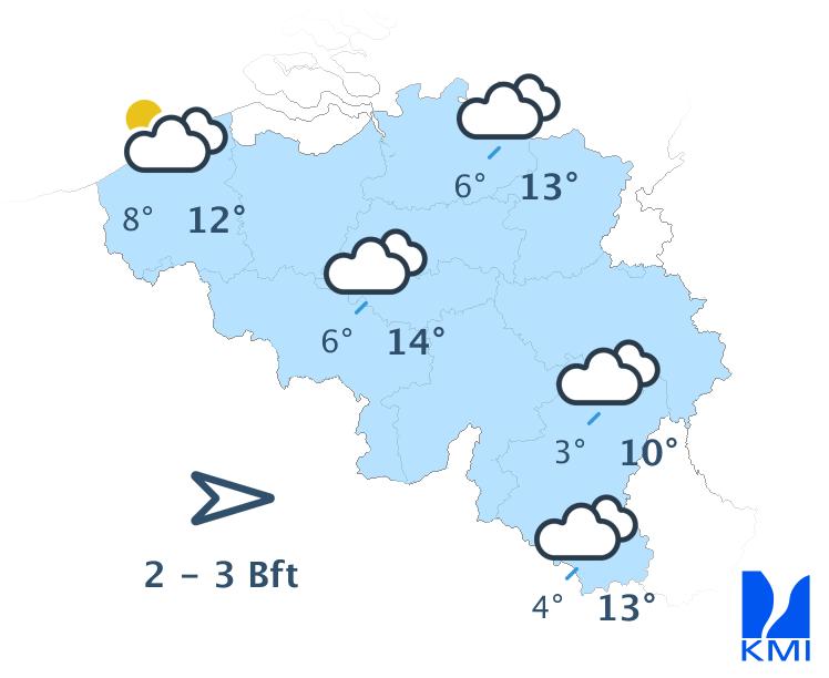 Maandag wordt het wisselend bewolkt met soms wat regen of een bui. De maxima liggen tussen 8 en 12 graden bij een overwegend matige wind uit west tot noordwest.