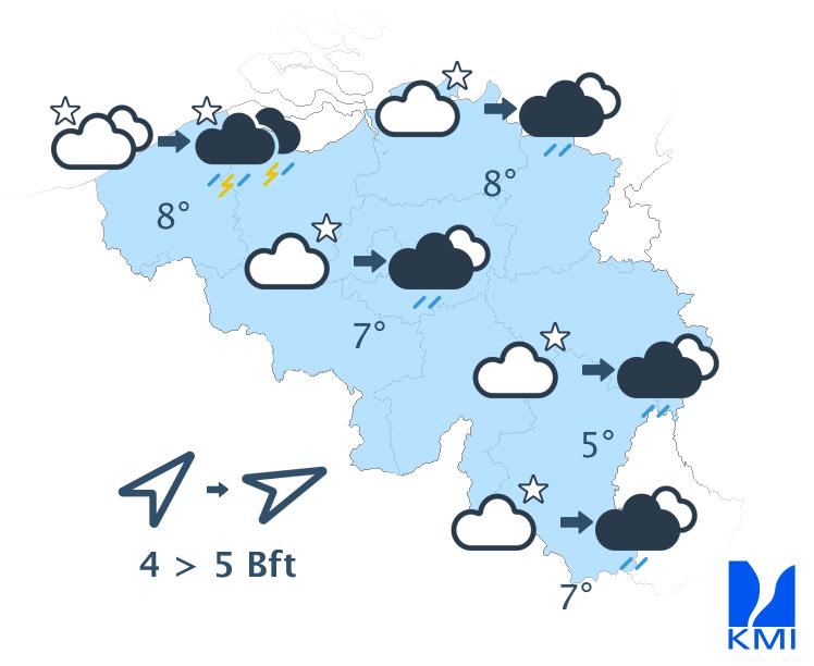 Vanavond is het nog droog en trekken er tijdelijk brede opklaringen over het land. Later vannacht trekt een koufront snel van west naar oost over het land met buiige regen. Daarachter volgen buien die tegen de ochtend gepaard kunnen gaan met een donderslag. De minima liggen tussen 3 en 8 graden. De zuidwestenwind neemt verder toe en wordt vrij krachtig in het binnenland en krachtig aan zee. Tijdens de passage van het koufront draait de wind naar westzuidwest of west en zijn er tijdelijk rukwinden mogelijk tussen 70 en 85 km/h. Voor en na het koufront schommelen de rukwinden eerder rond 65 km/h.